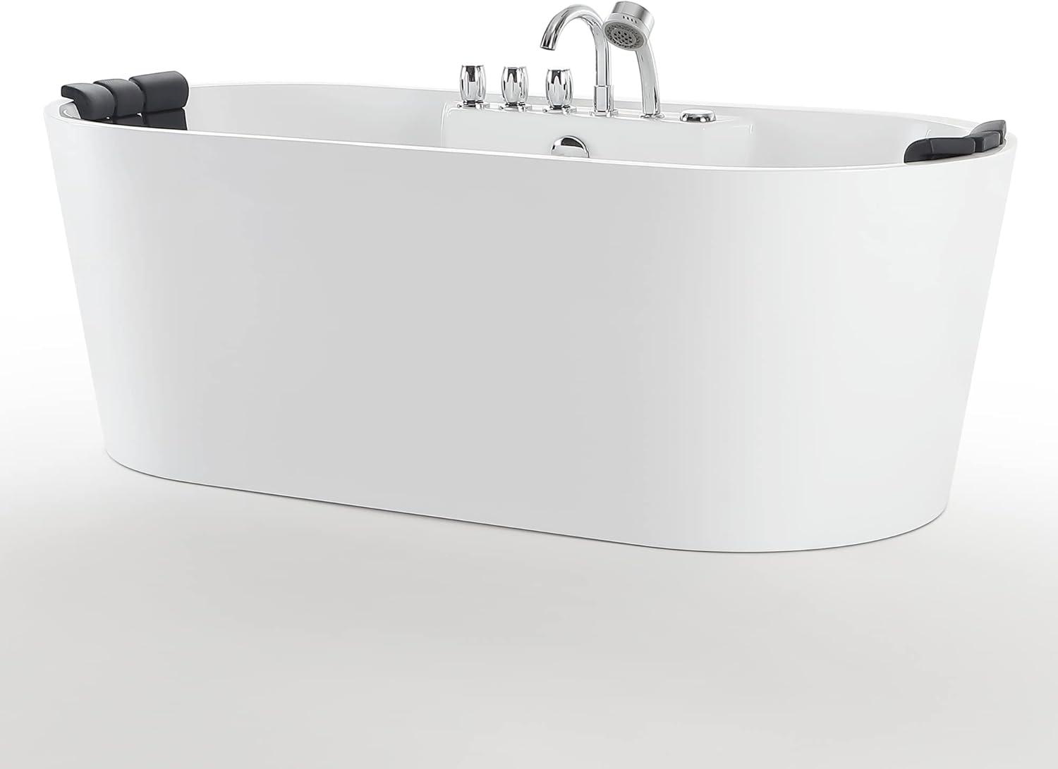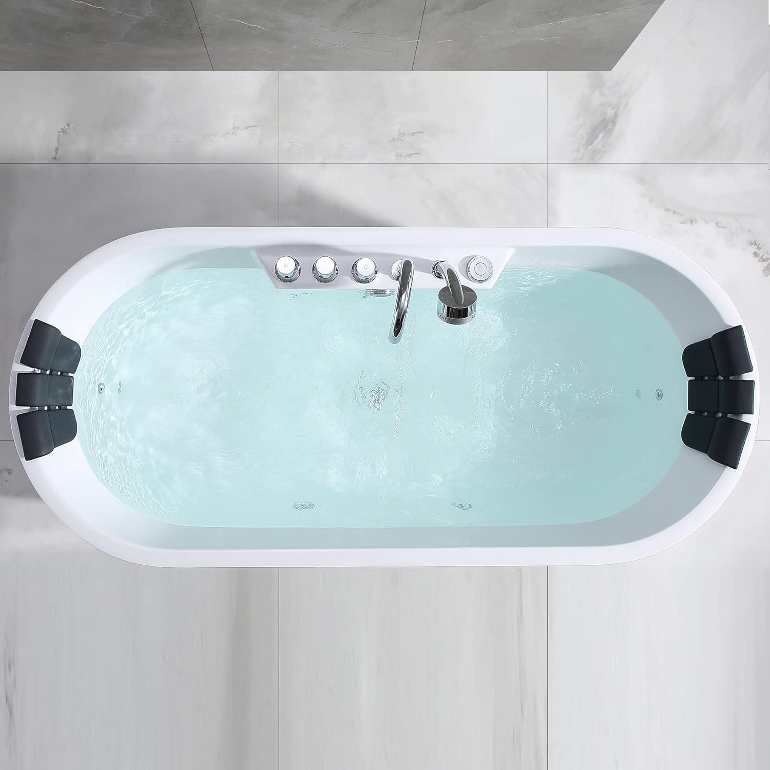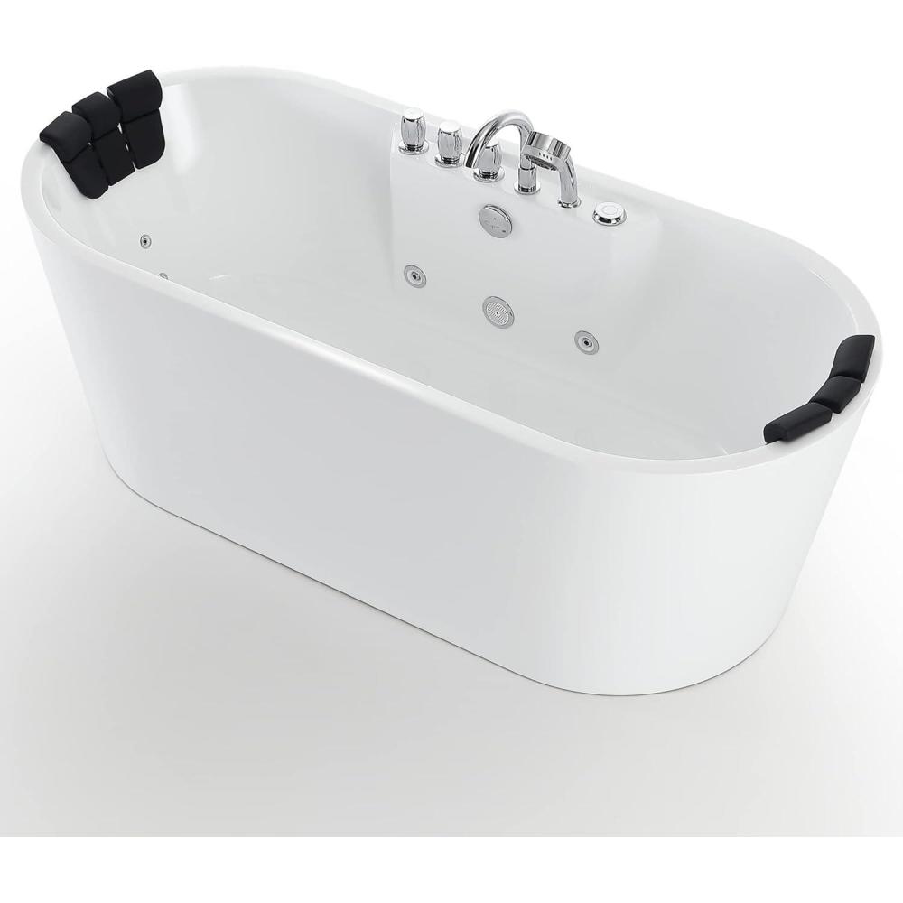 With 8 adjustable water jets, the Whirlpool Bathtub 67 in. Oval Massage Whirlpool Bathtub delivers a relaxing and rejuvenating hydromassage specifically targeted to your lumbar, legs and feet to promote blood circulation and to the back for total body relaxation. Lay back and relax as the Whirlpool Bathtub provides deep immersion allowing you to cover your entire body in water for a more relaxing experience, the black headrest provides a comfortable place to rest your head. The ergonomic control knobs allow you to effortlessly control your new whirlpool bath. The Whirlpool Bathtub Freestanding tub allows for total immersion, affording the best conditions to fully appreciate the unparalleled whirlpool experience.