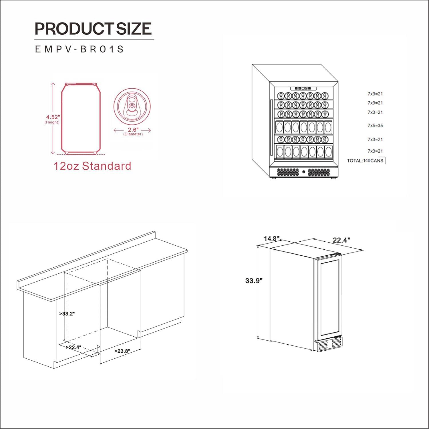 Serving your favorite beverages at the ideal temperature is easy with the 3 cu.ft Empava Beverage Cooler. The cooler's elegant, sturdy chrome shelves are adjustable to offer versatile storage options and the unit can hold up to 84(12 oz.) beverage cans for your convenience. The tempered, smoked glass door and stainless steel frame and handle offer durability and an attractive look. The cooler can be built-in or left freestanding to suit your needs.