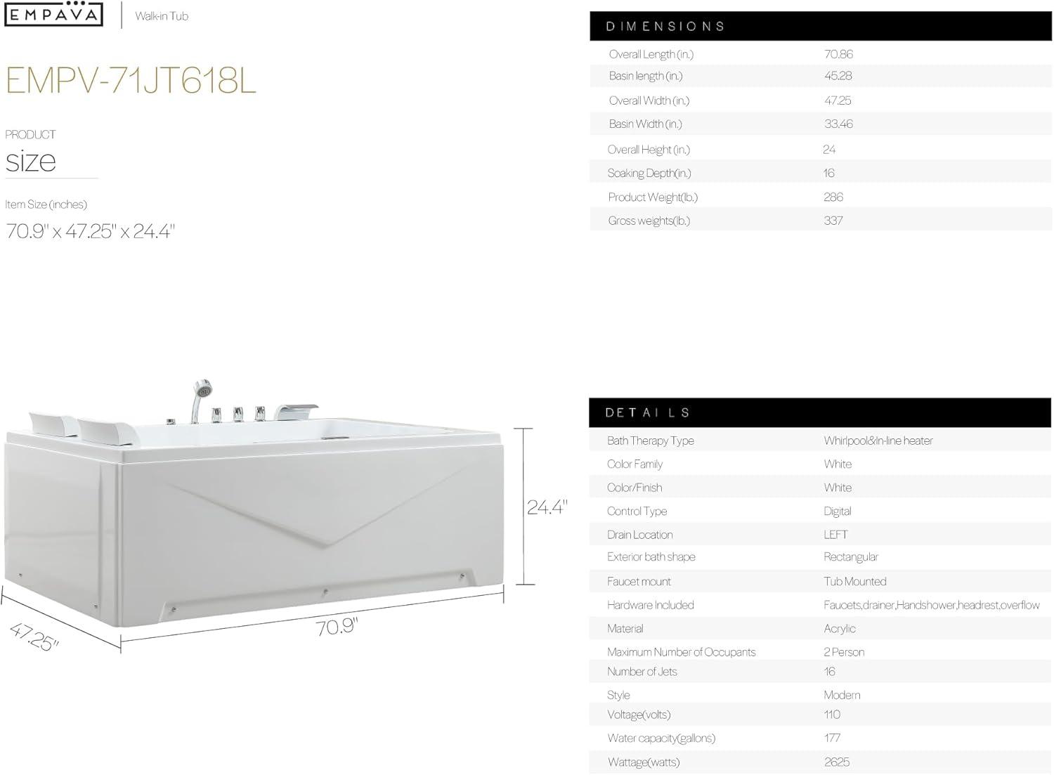 16 Hydro Massage Jets Magic:With careful placement of each jet(8 adjustable jets + 8 air jets ), Empava whirlpool bathtub targets key areas of the back,feet,hands and legs.Hydro massage tub help pain relief, reduce stress,and improve sleep.