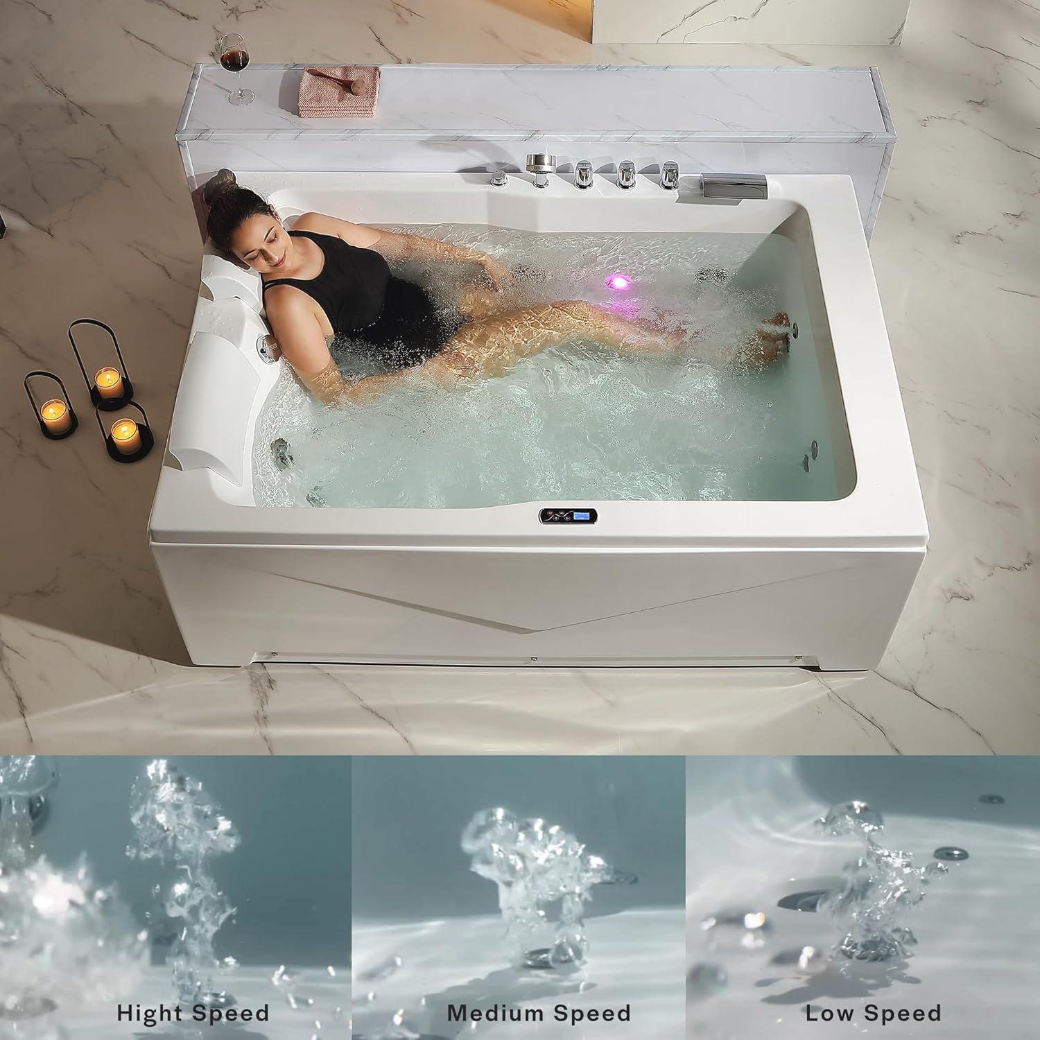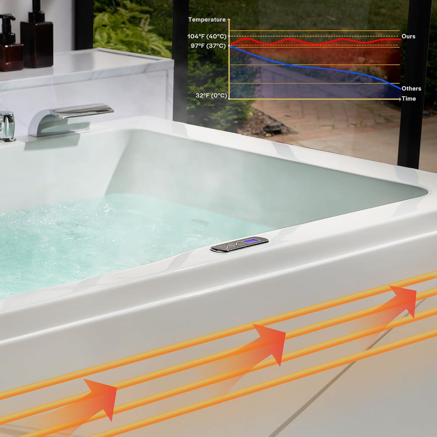 Upgraded High Quality Jetted Tub: Crafted from glossy 100% acrylic reinforced with fiberglass and a stainless-steel frame, this tub supports up to 900 lbs while maintaining sleek elegance for decades of relaxation.The double walled ensures maximum insulation.