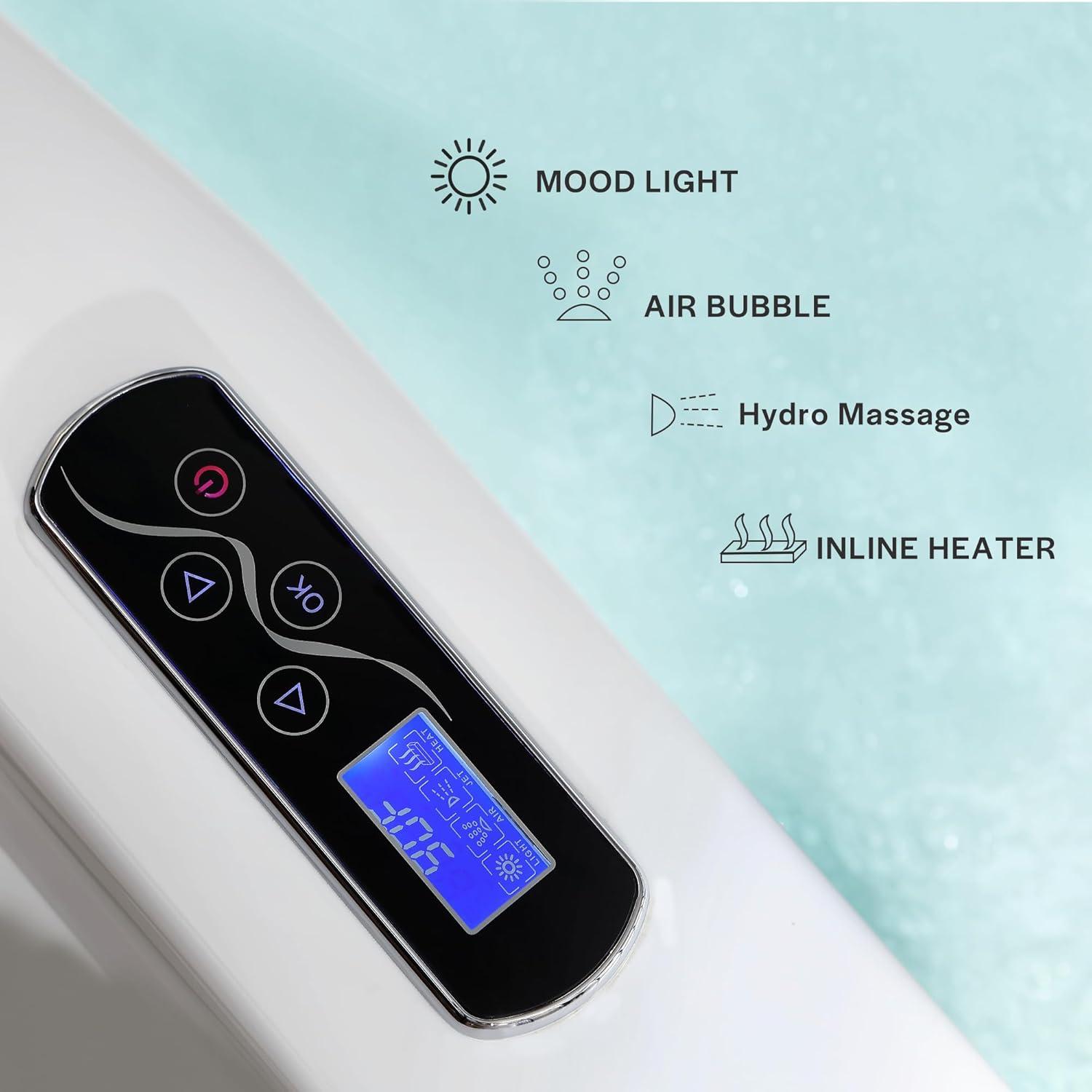 The inline heater maintains your ideal water temperature via LED controls panel, Our bathtub allows for a longer soak without adding more hot water(maintain a water temperature between 96.8°F and 104°F). The panel can adjust the massage function and the color of the LED light, one-touch control possible.