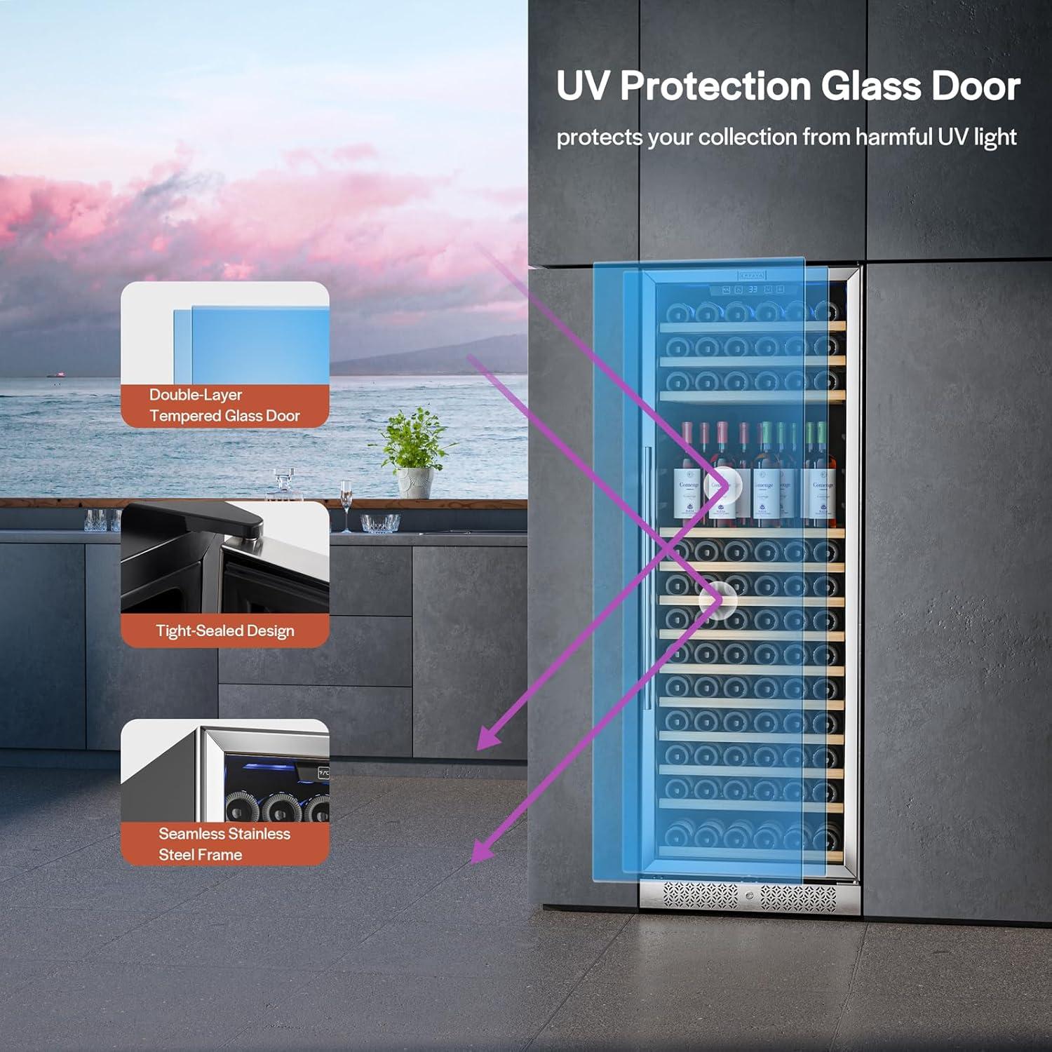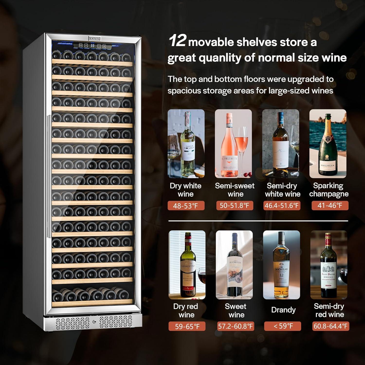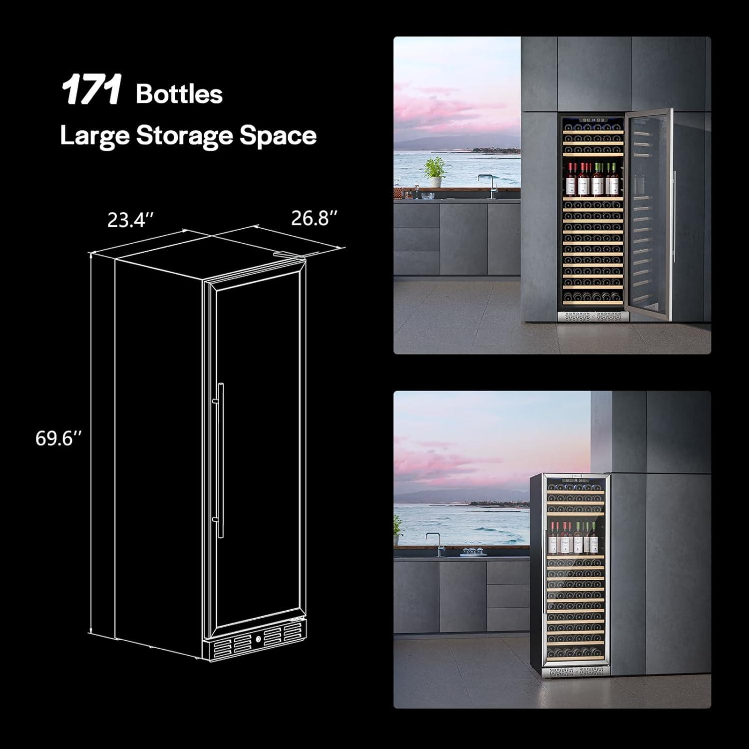 【171 BOTTLES LARGE CAPACITY】 The 127 bottles wine fridge comes with 16 beech woods and can store up to 171 bottles of standard Bordeaux (750ml) wine and the bottom shelf has a large capacity so you can load large bottles.