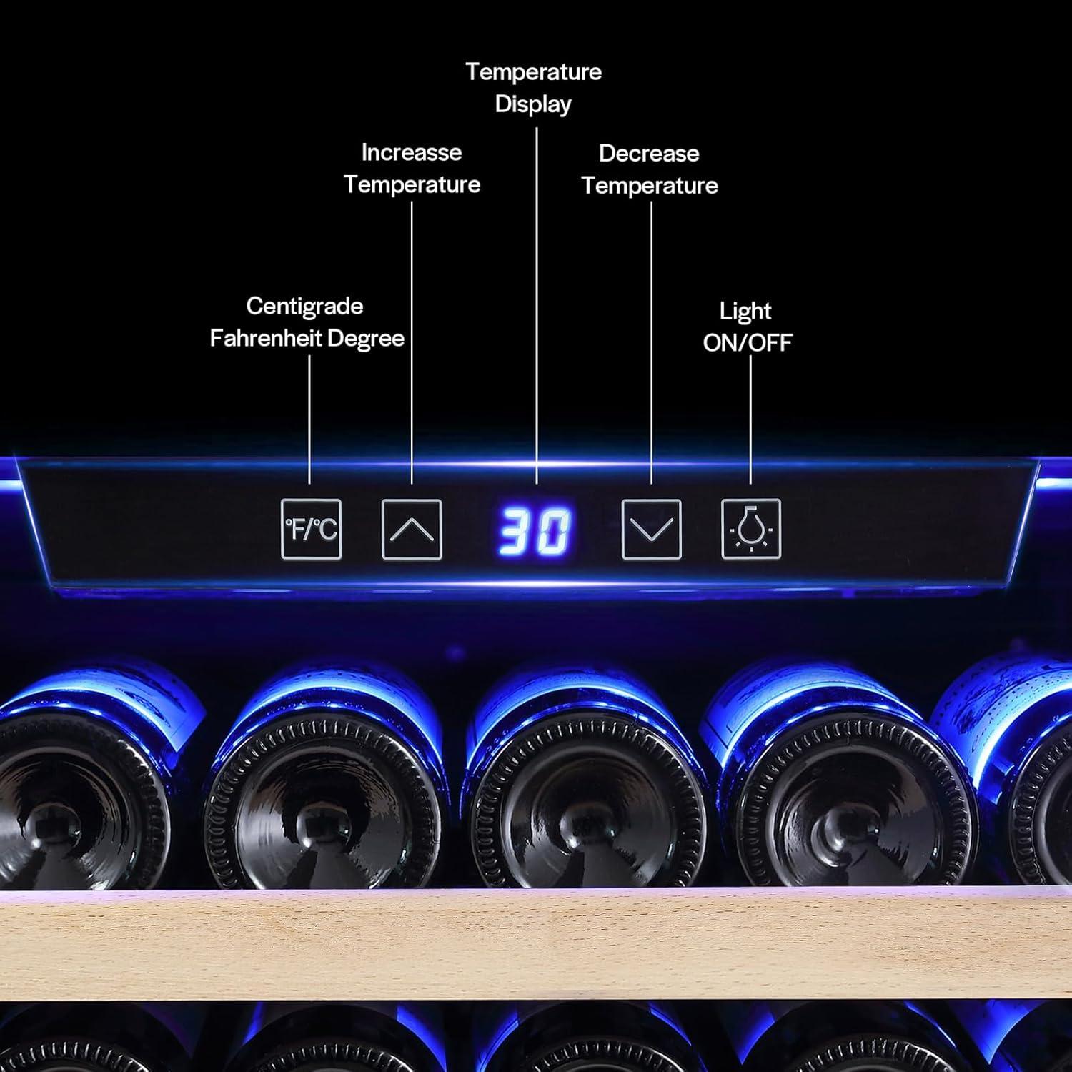 【ACCURATE TEMPERATURE SETTING】 The wine cooler refrigerator control display makes it easy to set temperatures from 40°F-66°F and 5°C- 19°C. You can easily and precisely set the temperature level to your liking. And switch the temperature display to ℃ or ℉. Even in the dark, the blue LED light allows you to better see inside the wine for easy wine selection.