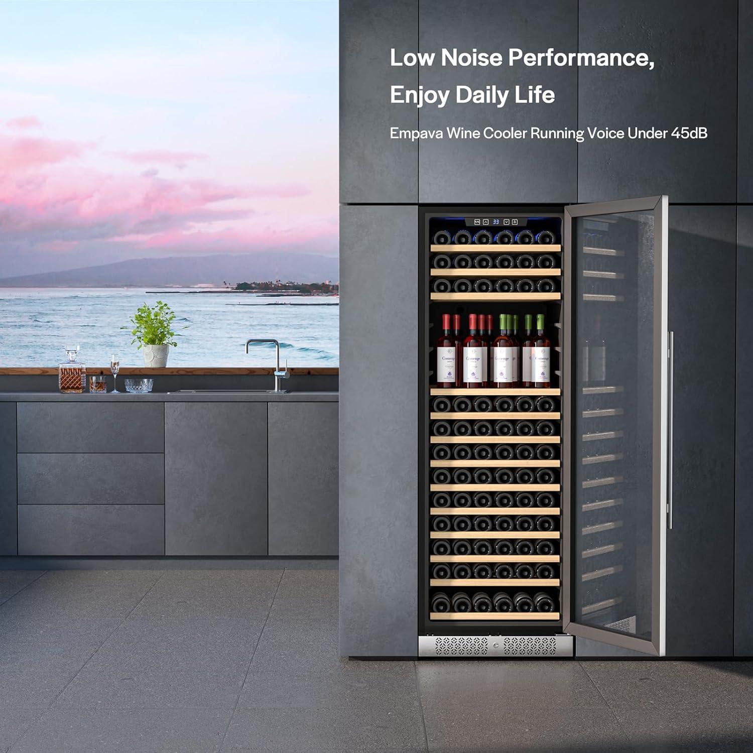 The roomy Empava Wine Fridge slides easily between standard base cabinets to create the ultimate wine enthusiast wine refrigerator in your custom kitchen. It can also stand alone anywhere you like. This sleek and slim 171 bottle wine cooler allows you to tuck your reds or whites away behind a tempered glass door. Effortlessly examine which bottle you'll indulge in next with fully extended smooth shelving.