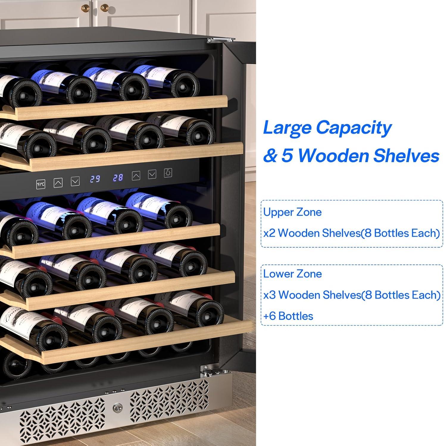 【171 BOTTLES LARGE CAPACITY】 The 127 bottles wine fridge comes with 16 beech woods and can store up to 171 bottles of standard Bordeaux (750ml) wine and the bottom shelf has a large capacity so you can load large bottles.