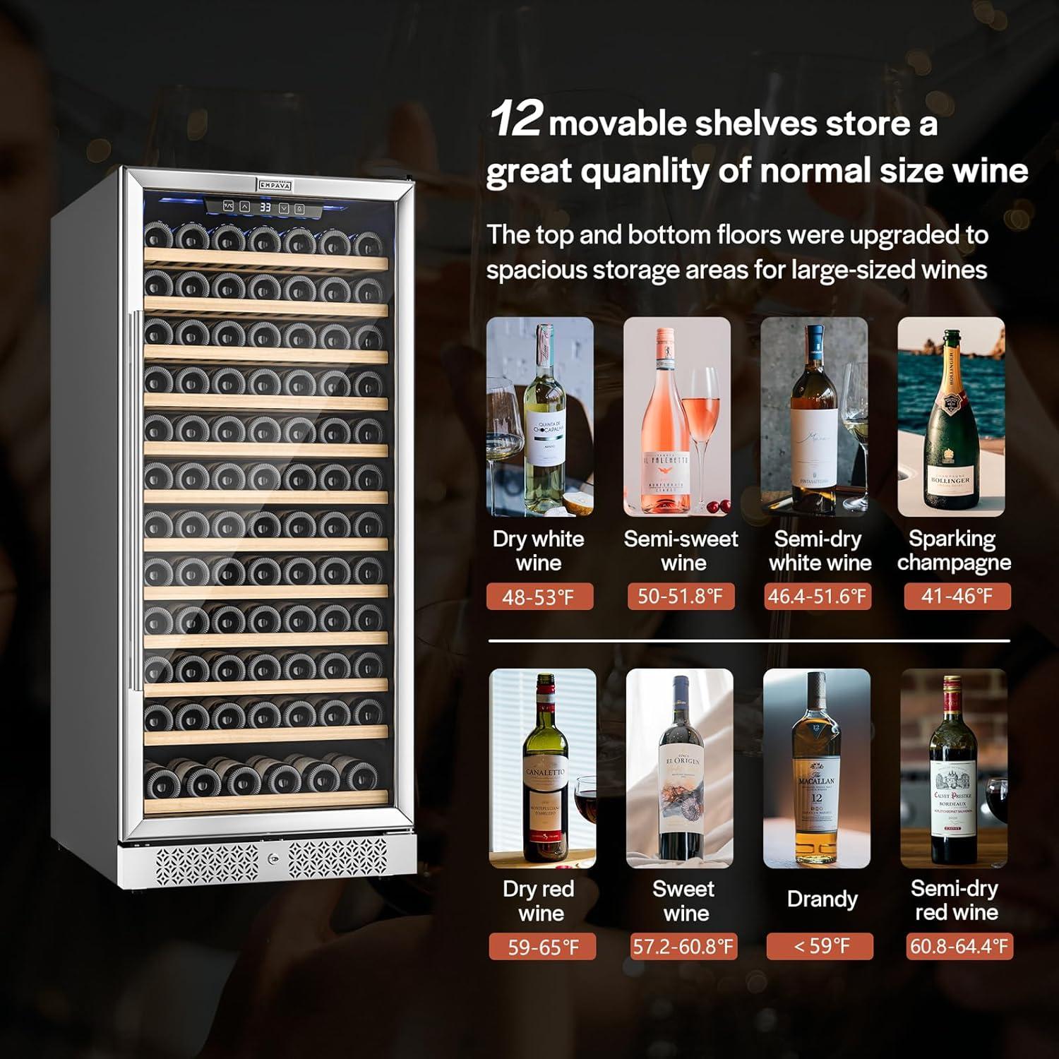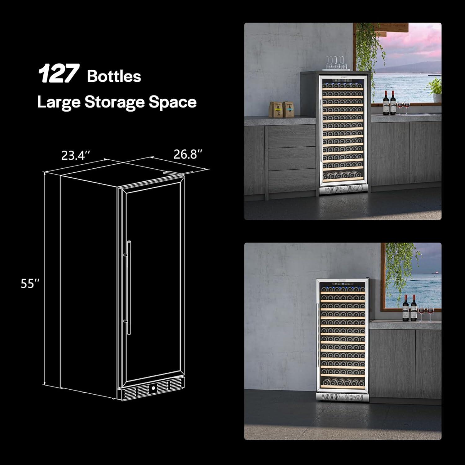 【127 BOTTLES LARGE CAPACITY】 The 127 bottles wine fridge comes with 12 beech woods and can store up to 127 bottles of standard Bordeaux (750ml) wine and the bottom shelf has a large capacity so you can load large bottles.