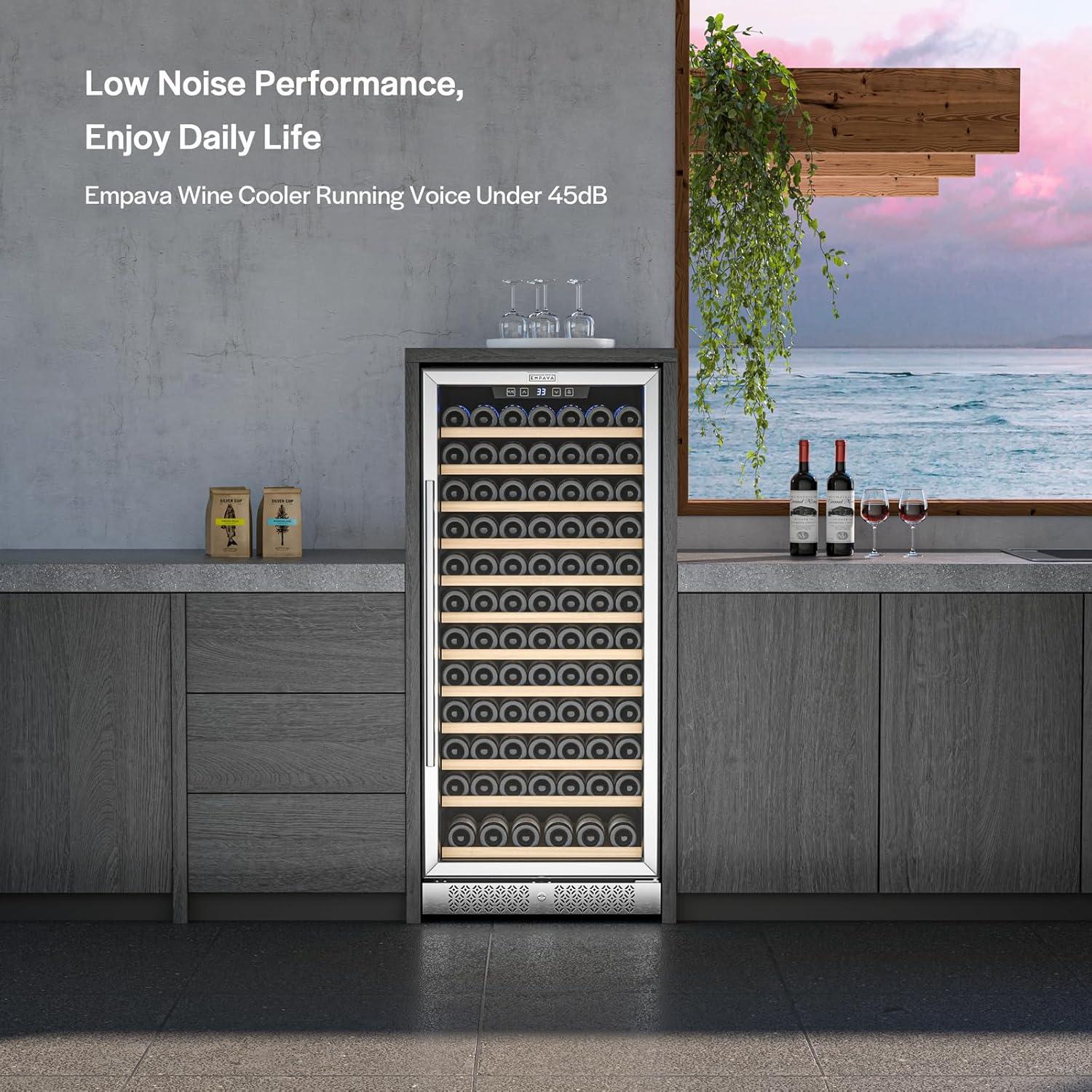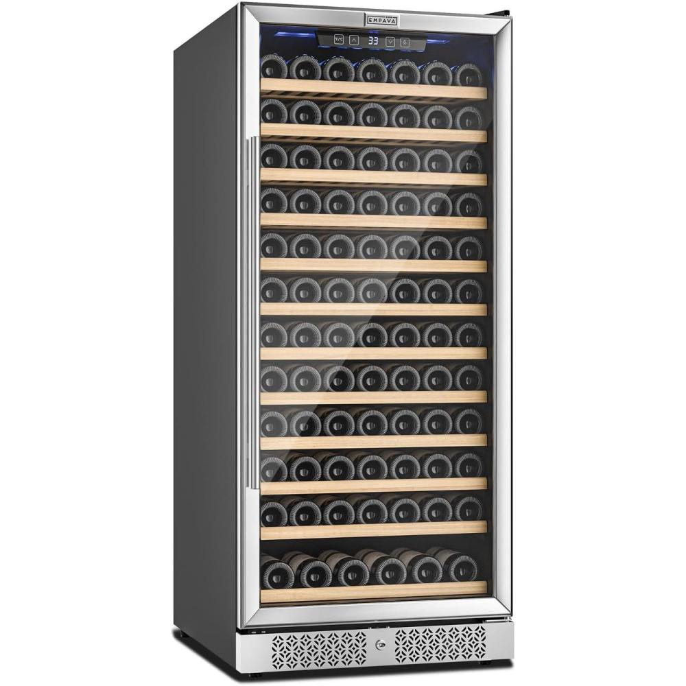 The roomy Empava Wine Fridge slides easily between standard base cabinets to create the ultimate wine enthusiast wine refrigerator in your custom kitchen. It can also stand alone anywhere you like. This sleek and slim 127 bottle wine cooler allows you to tuck your reds or whites away behind a tempered glass door. Effortlessly examine which bottle you'll indulge in next with fully extended smooth shelving.