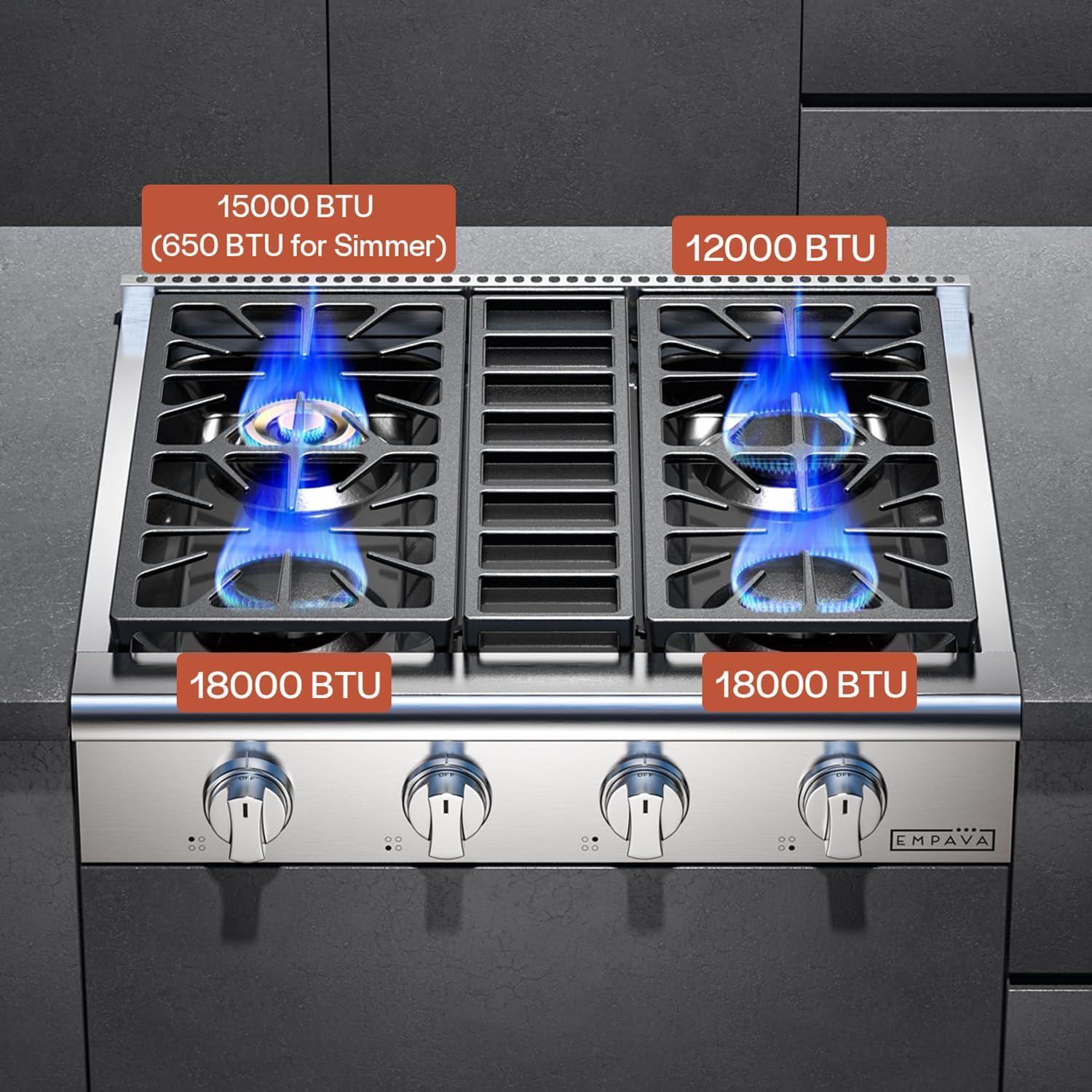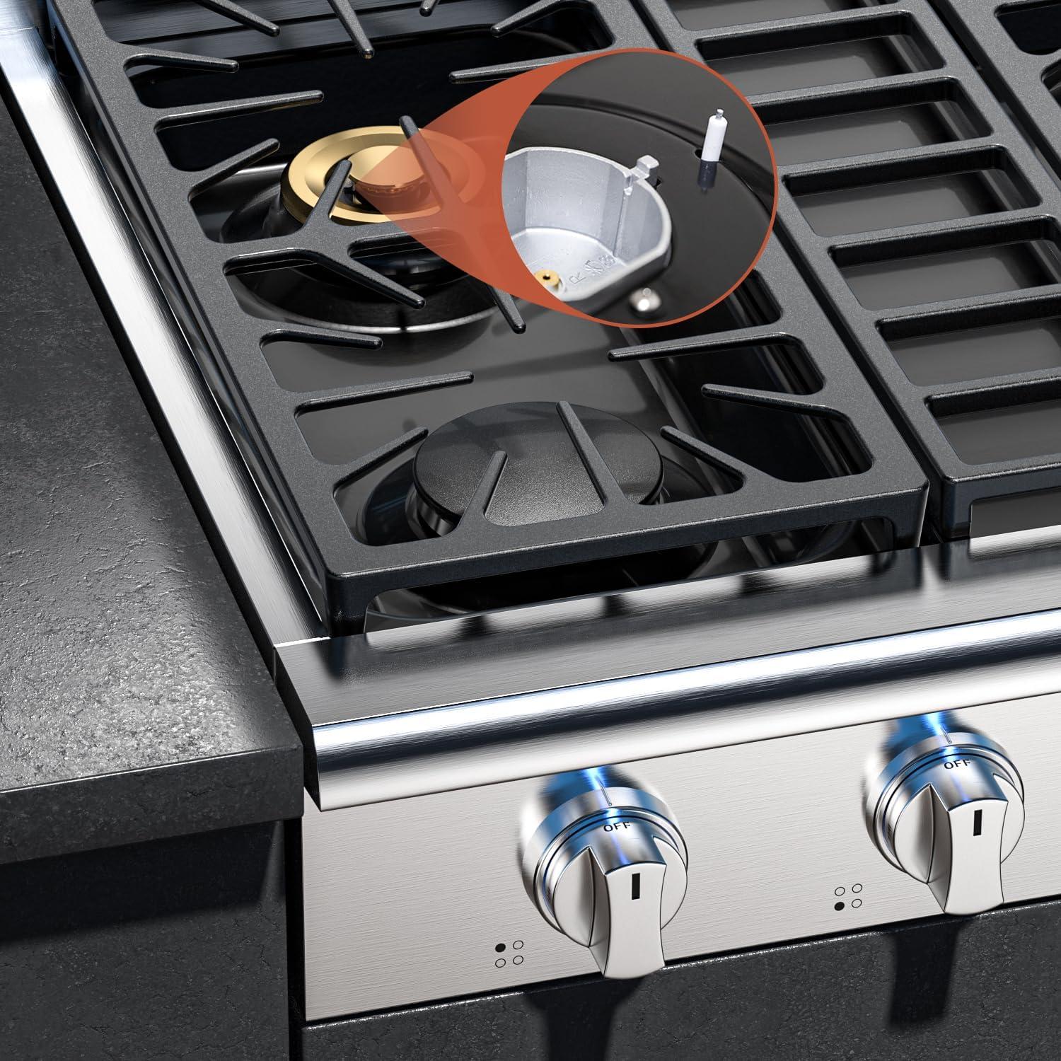 The slide-in gas range top offers you flexibility you need to make all your favorite dishes with precision. Come with 4 versatile burner size, two single 18000-BTU burners, one single 12000-BTU burner, a dual ring 15000-BTU burner (650-BTU for simmer) distribute even heat for simmer, boil, stir-frying, steaming, melting or even caramelizing!