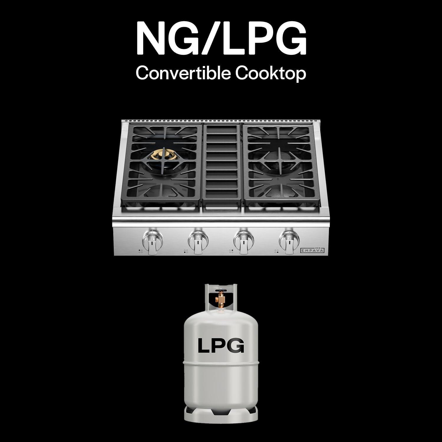 Now you are cooking! Enjoy all these features even more by knowing this gas range top cooktop. Product dimensions: 30 in. W x 28. 38 in. D x 8. 72 in. H. Cutout dimensions: 30. 12 in. W x 24. 77 in. D x 7. 3 in. H. Pre-installed for natural gas (gas regulator included), can be converted to liquid propane gas use (LPG conversion kit not included). Pre-installed US standard 120v GFCI power cord (electric ignitor), 15 amps breaker required.
