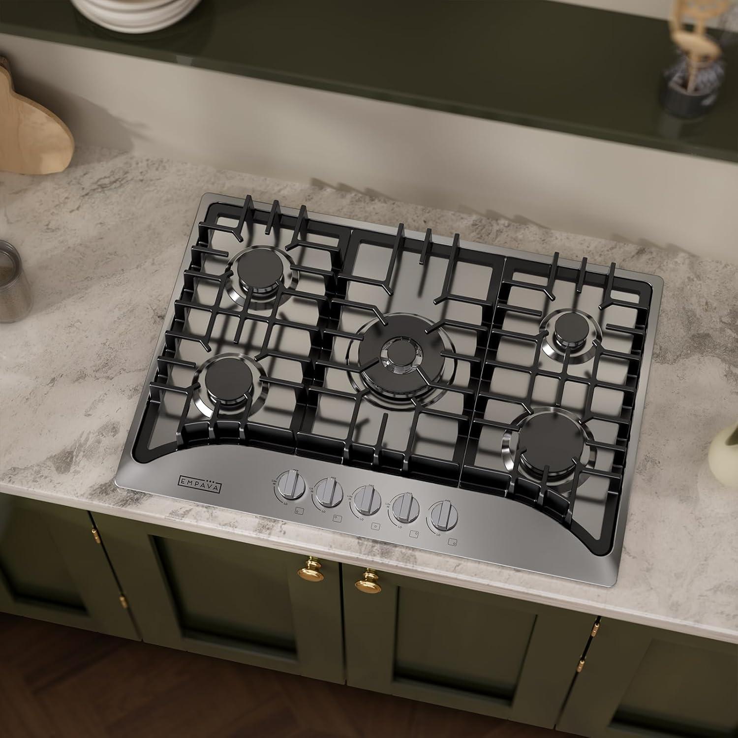 SABAF Burners with Safety Shut-Off – Features five Italian SABAF burners with flame failure thermocouples that automatically shut off gas if the flame goes out for enhanced safety.