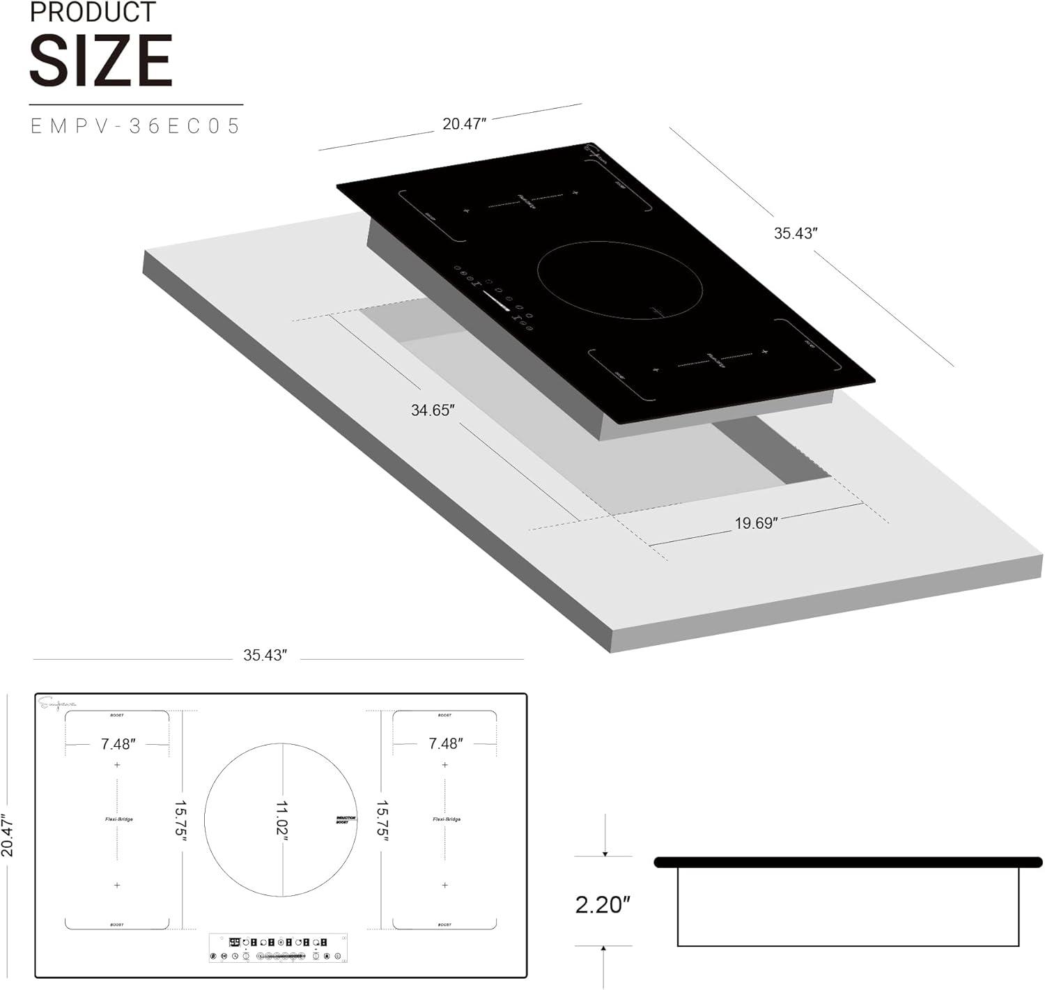 Product Dimensions: 35.43 in. W x 20.47 in. D x 2.20 in. H, Cutout Dimensions: 34.65 in W x 19.69 in D. Minimum circuit breaker amperage 50A, 240V hard-wiring included, Designed and Engineered in the USA with 2 Years US Based Manufacturer Warranty. ETL, CETL and FCC Certified