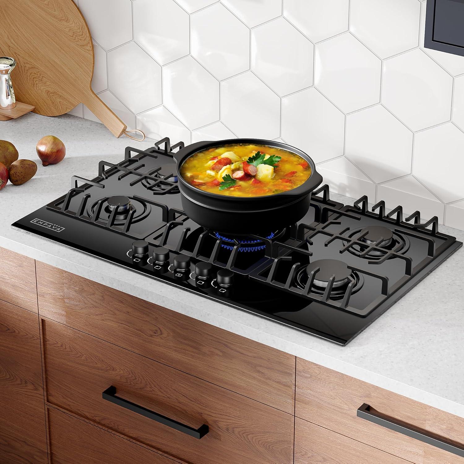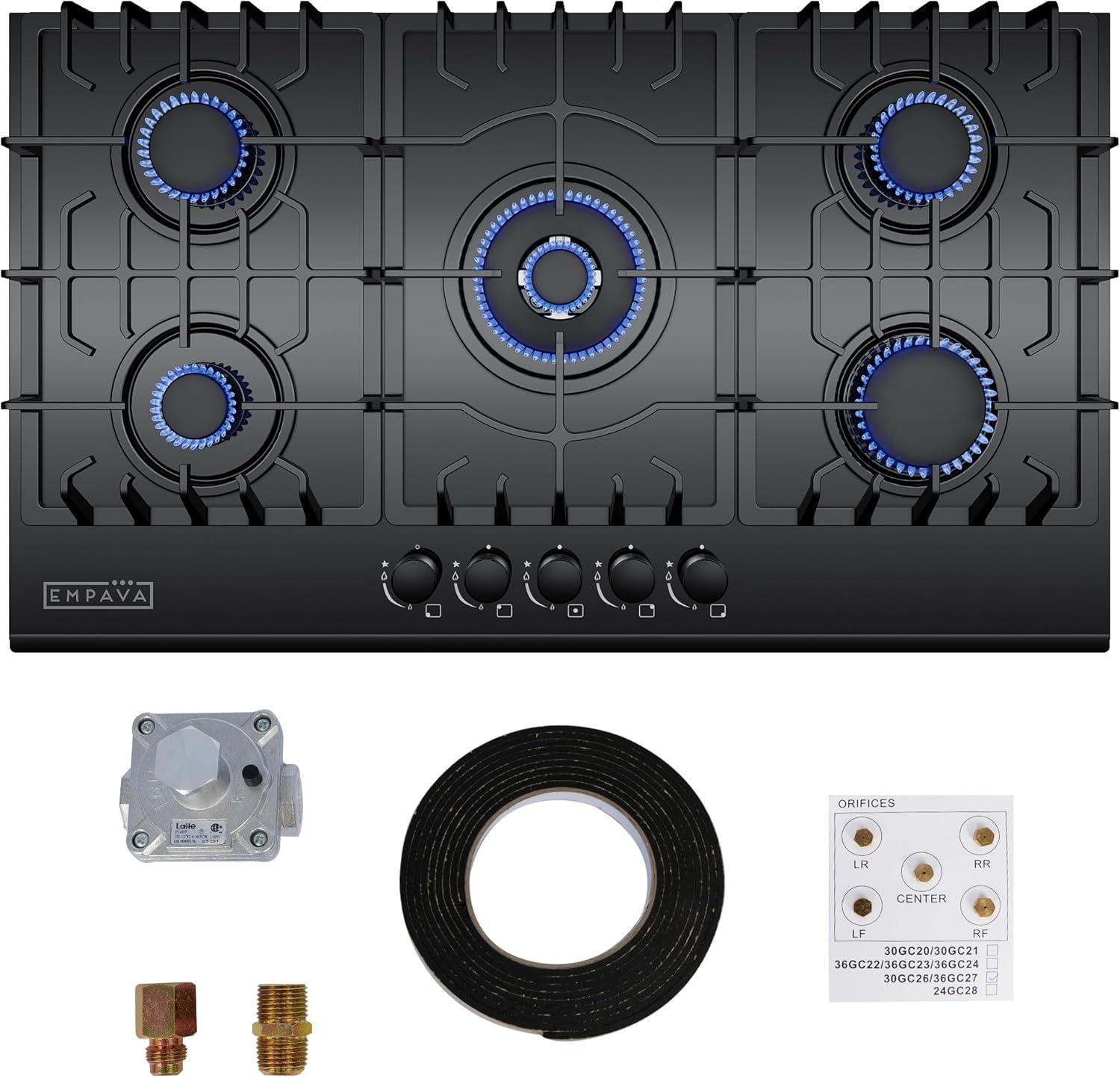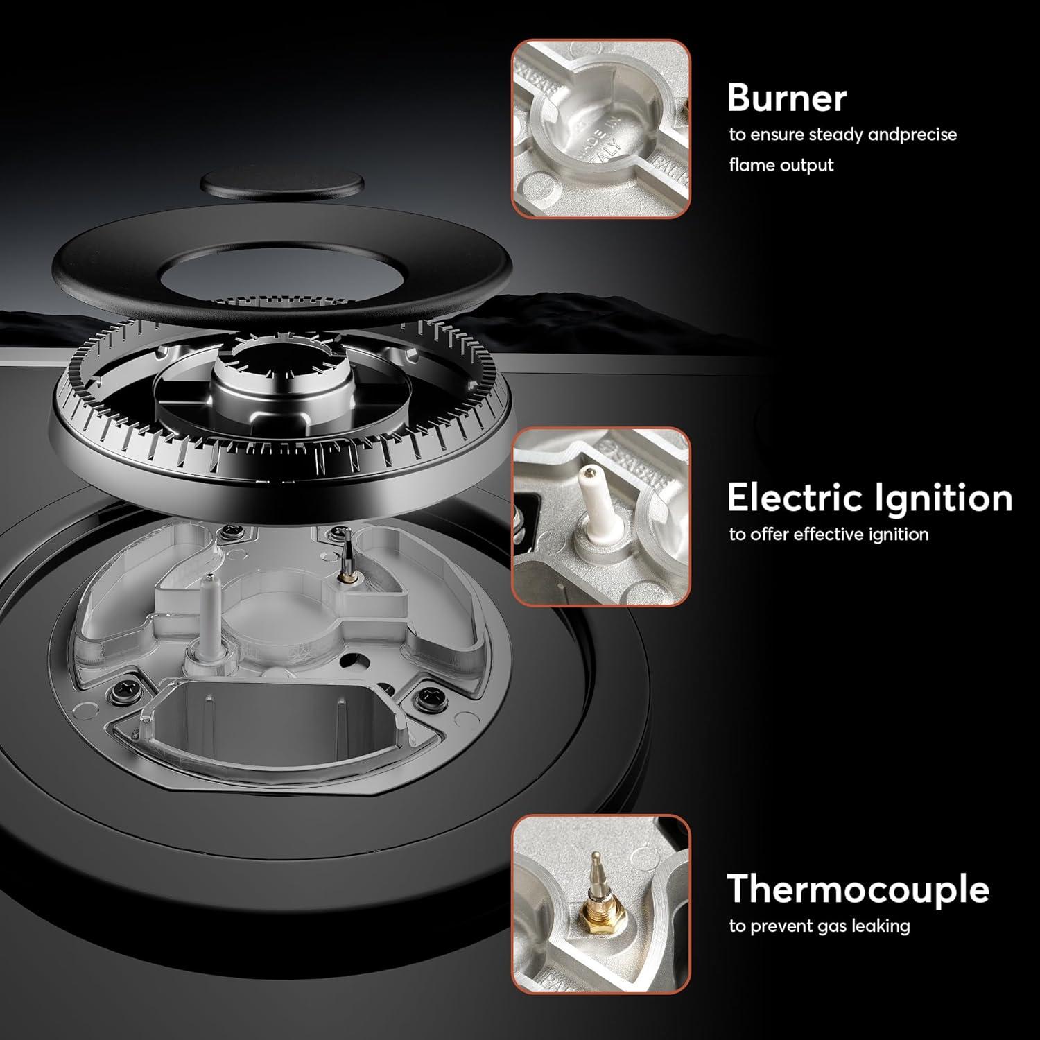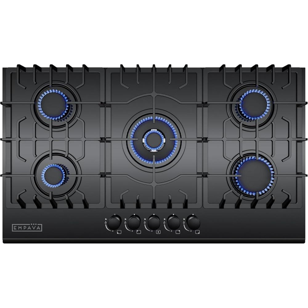 Empava recessed gas cooktop offers you the flexibility you need to make all your favorite dishes with precision and flair 4 different versatile burner size with a Dual Ring 12000-BTU burner, a 10000-BTU burner, double 6500-BTU burner and 4000-BTU burner distribute even heat for simmer, boil, stir-frying, steaming, melting or even caramelizing!