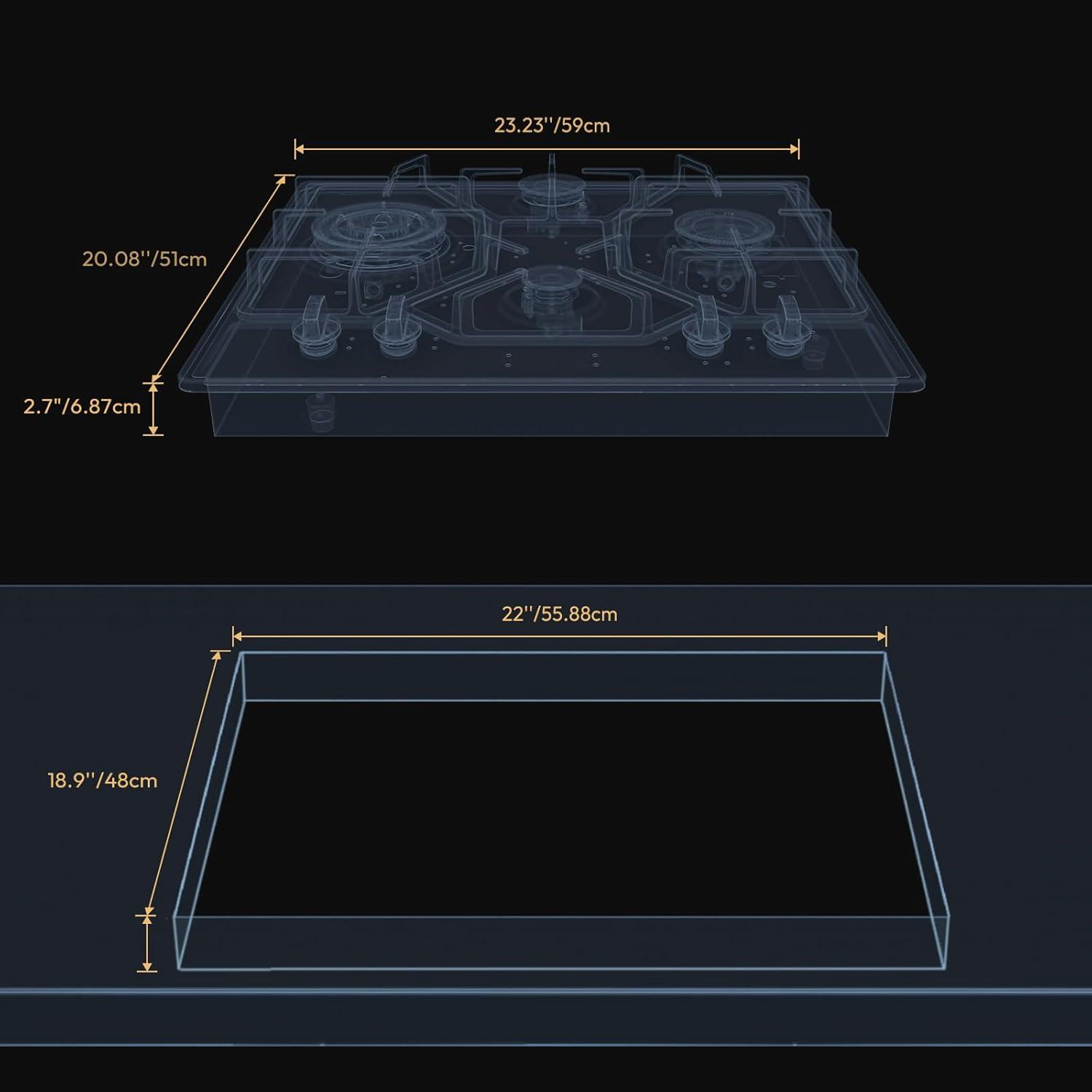 Enhance your cooking experience with this cooktop's impressive features. The product dimensions are 36″W x 20.67″D x 4.77″H, while the cutout dimensions are 34.25 inches in length and 19.61 inches in width. It comes pre-installed with a 120v power cord and includes LPG nozzles for your convenience.
