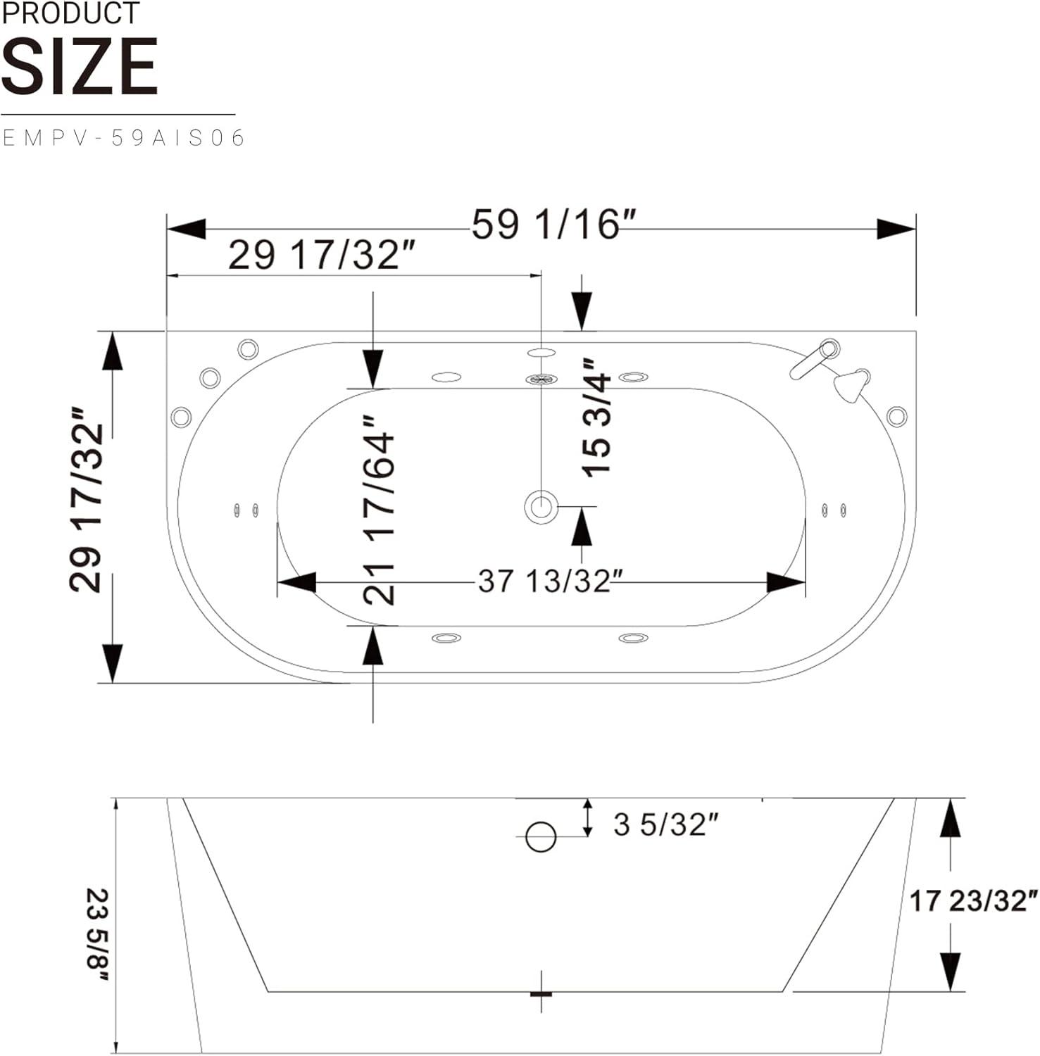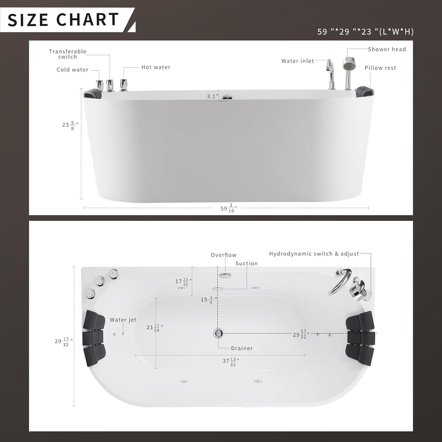 Spacious Dimensions: This freestanding whirlpool bathtub measures 59.06″L x 29.53″W x 23.62″H.The internal dimensions are 37.4″L x 21.27″W x 17.72″H, with a soaking depth of 14.56″, offering a spacious and comfortable bathing experience.