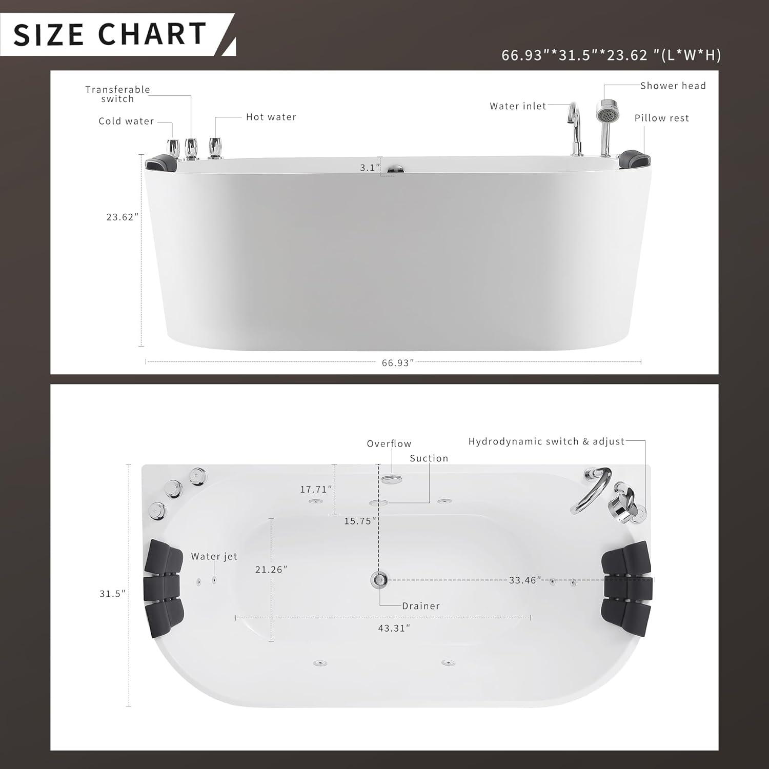 Measure Before Purchasing for Proper Fit: This freestanding whirlpool bathtub measures 59.06″L x 29.53″W x 23.62″H.The internal size is 37.4″L x 21.27″W x 17.72″H, with a soaking depth of 14.56″, offering a spacious and comfortable bathing experience.