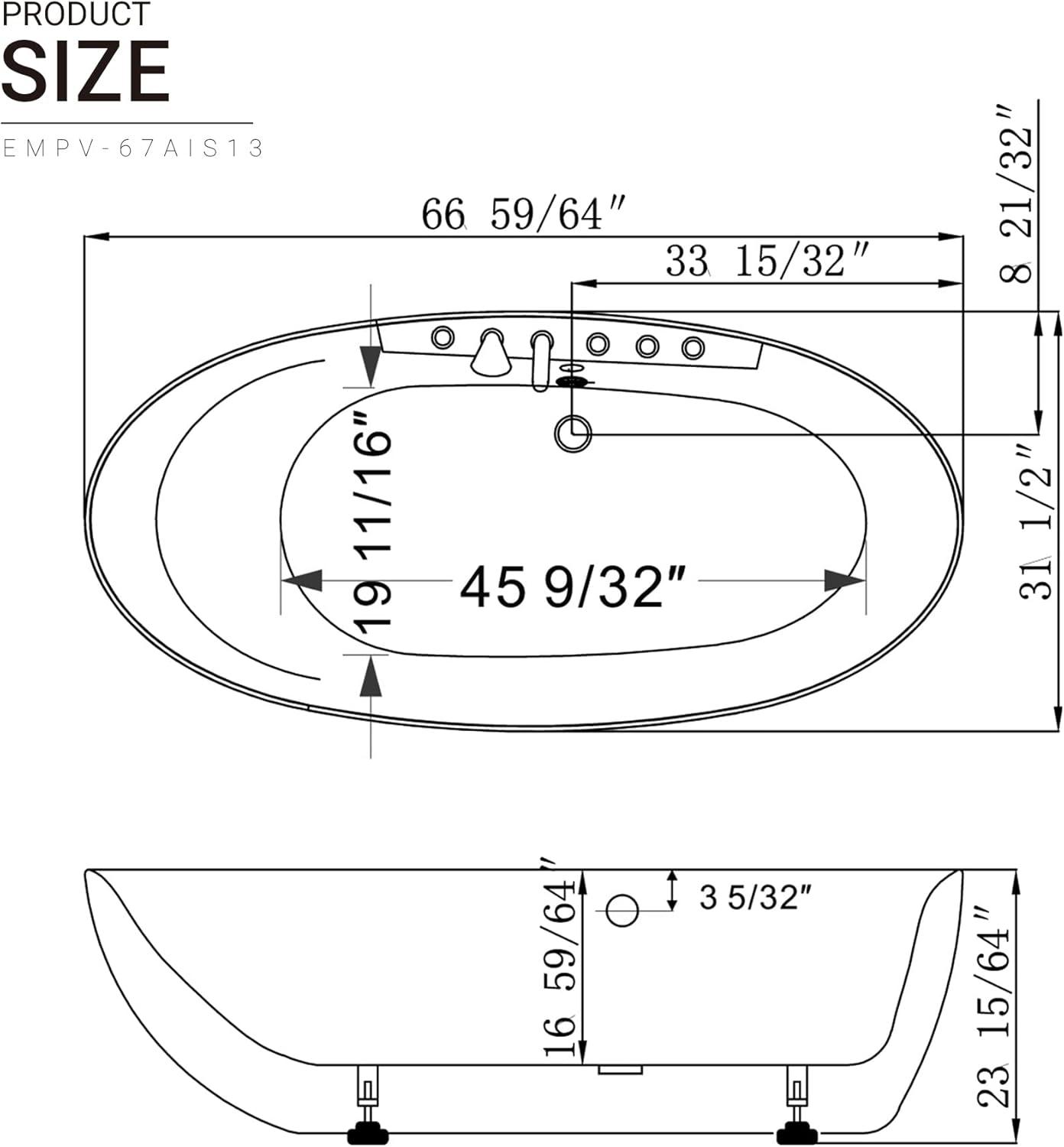 Outer Dimensions: 66.93 in. L x 31.50 in. W x 22.05 in. H and an effective bathtub capacity of 60 Gallons. UL Certified Motor. Take the time you deserve to relax and de-stress with the therapeutic benefits of the Acrylic Oval Bathtub.