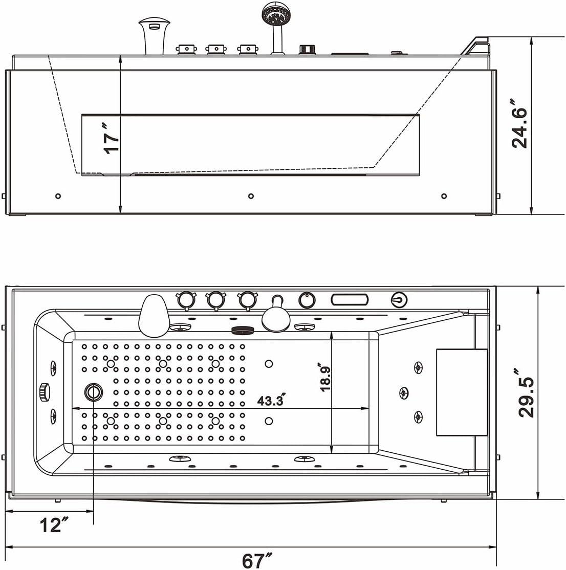 Outer Dimensions: 67 in. L x 29. 5 in. W x 25. 6 in. H and an effective bathtub capacity of 63 Gallons. UL Certified Motor. Take the time you deserve to relax and de-stress with the therapeutic benefits of the Acrylic Rectangular Bathtub EMPV-JTX351N.