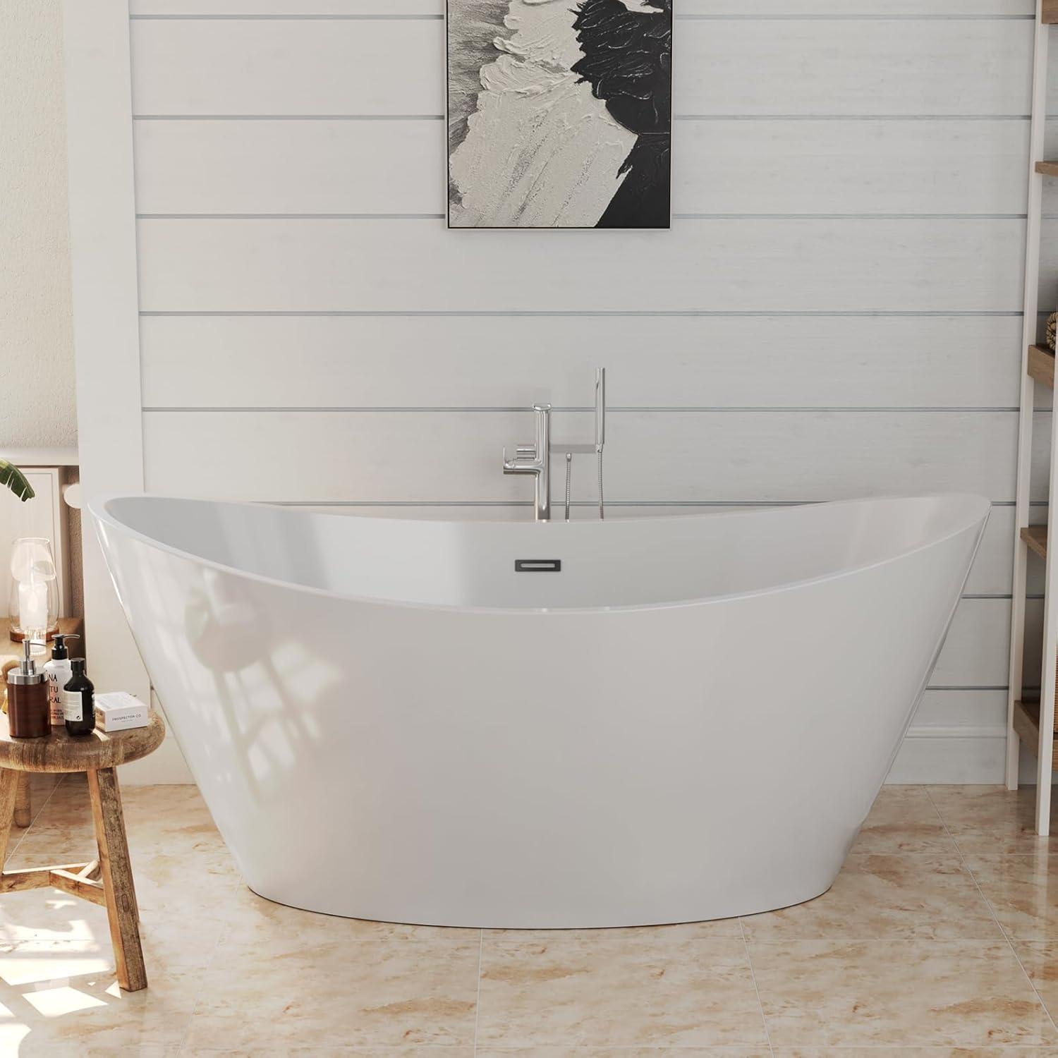 Empava 67″ Luxury Modern Bathroom Freestanding White Color Acrylic Bathtub Soaking SPA Tub With Drain and Overflow(67 In-Curved-1518)