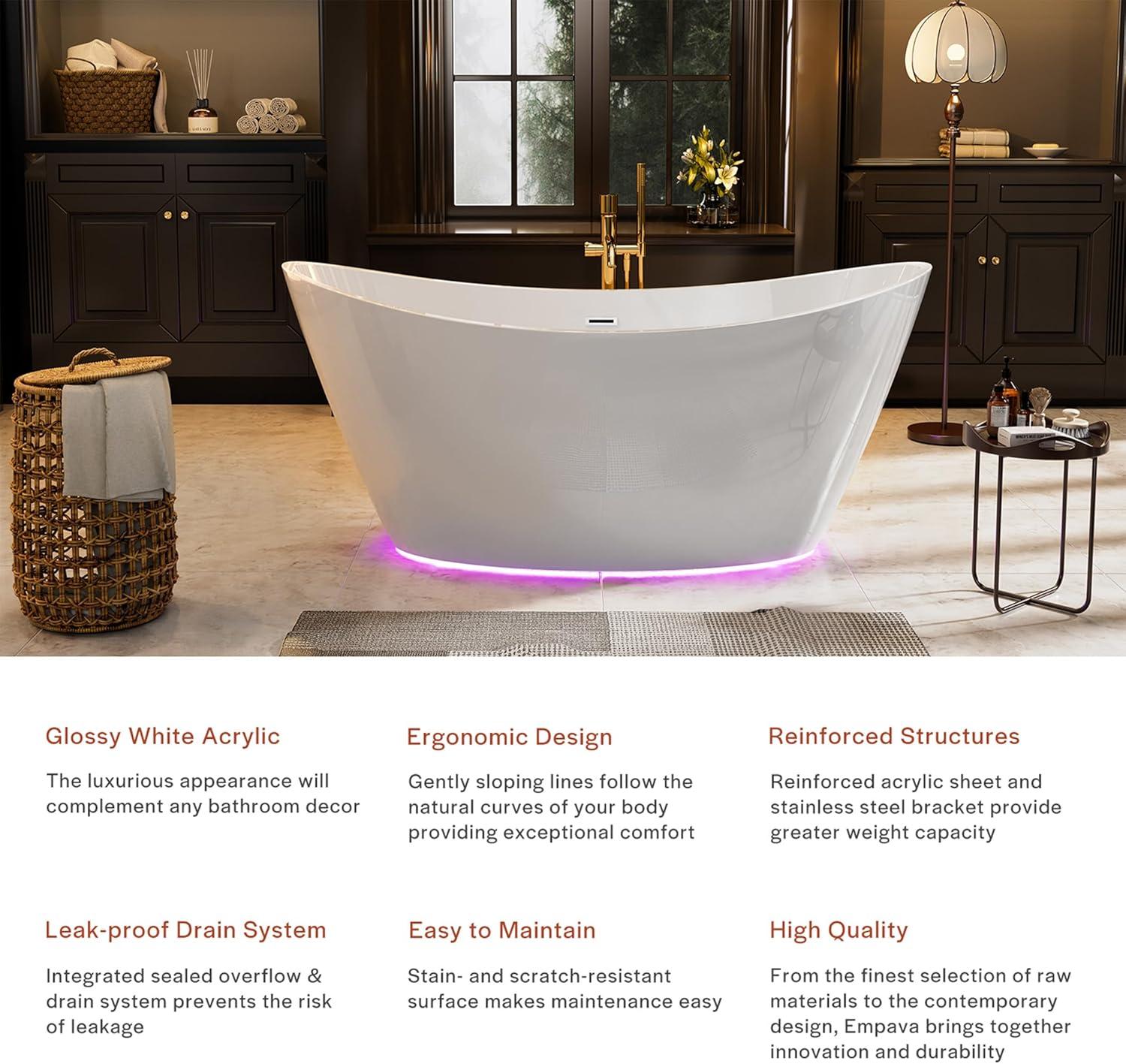 Ergonomic Comfort Design: The modern curved design of this bath tub is not just visually appealing but also ergonomically engineered to cradle your body for ultimate relaxation and support during soaking sessions