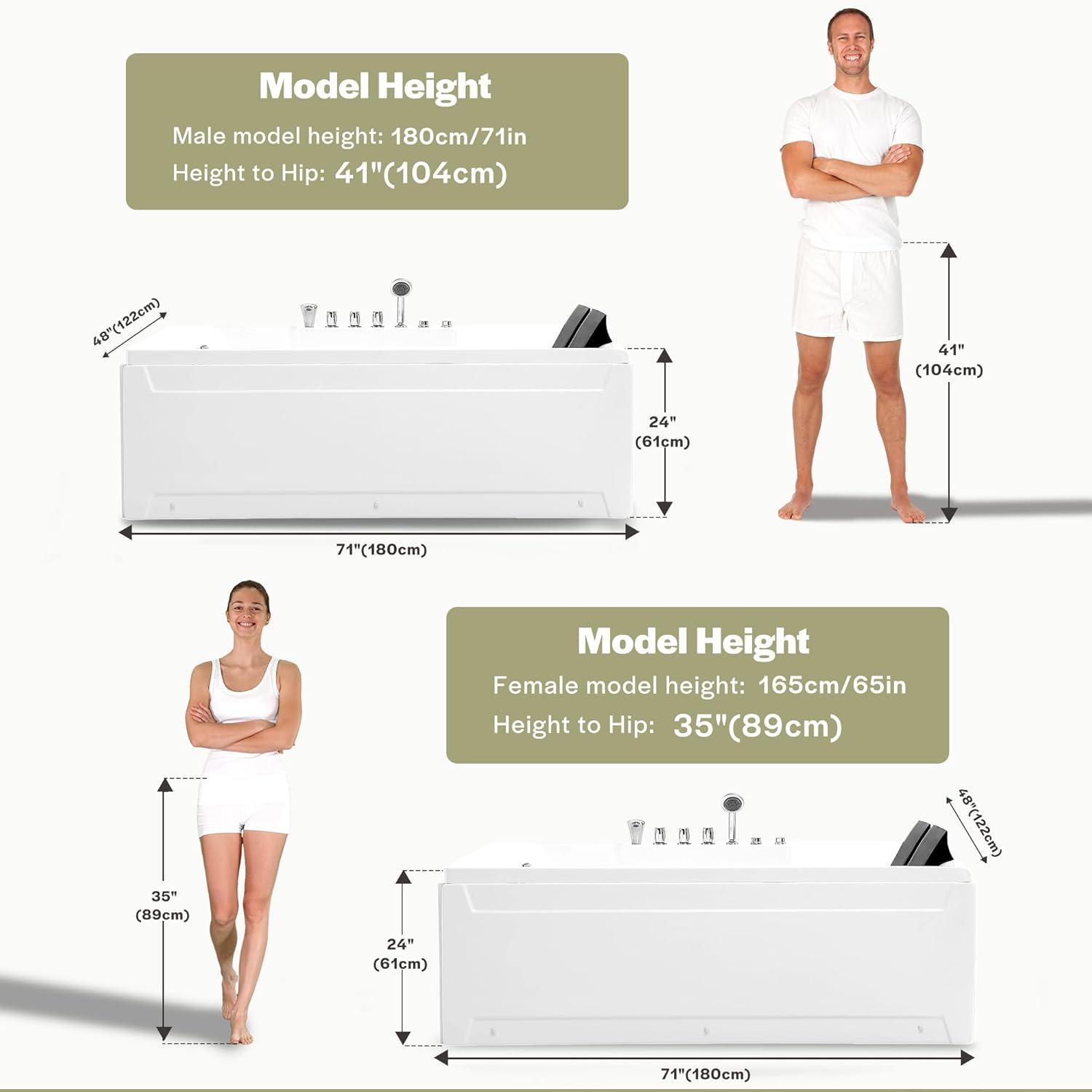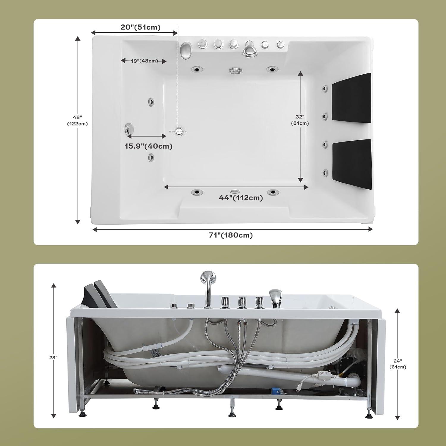 ETL Certified: This whirlpool bathtub with power plug is ETL certified, ensuring it meets the safety and performance standards. Product Dimensions: 72″ L x 48″ W x 24″ H.Water capacity: 110 gallons;Voltage: 110 Volt;Power: 1125 Watts; UL Certified Motor.