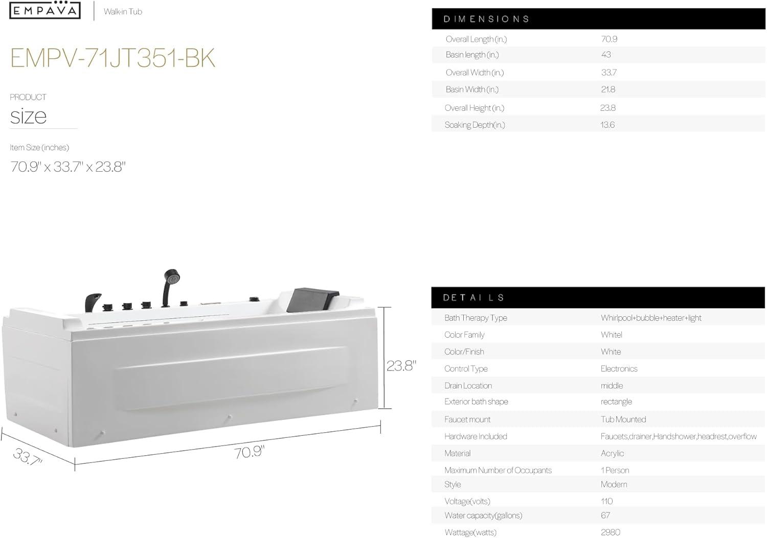 imageEmpava Acrylic Whirlpool Bathtub 71Inch Jetted Bathtub with Healing Chromotherapy Heated Soaking Tub with LED Control Panel Comforting Hydro Massage Tub with Waterfall Joy Black Pillow71JT351BK