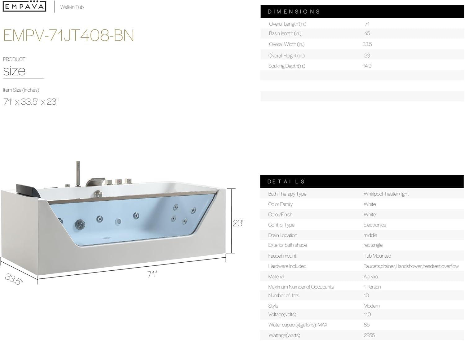 Save big on Empava Acrylic Whirlpool Bathtub, 71-Inch Jetted Bathtub with Heater, 10 Jets Hydromassage with Chromatherapy, 3-Side Apron with LED Control Panel, Waterfall, Black Hardware and Nozzles(71JT408-BN) during our summer blowout sale. Limited quantities available.