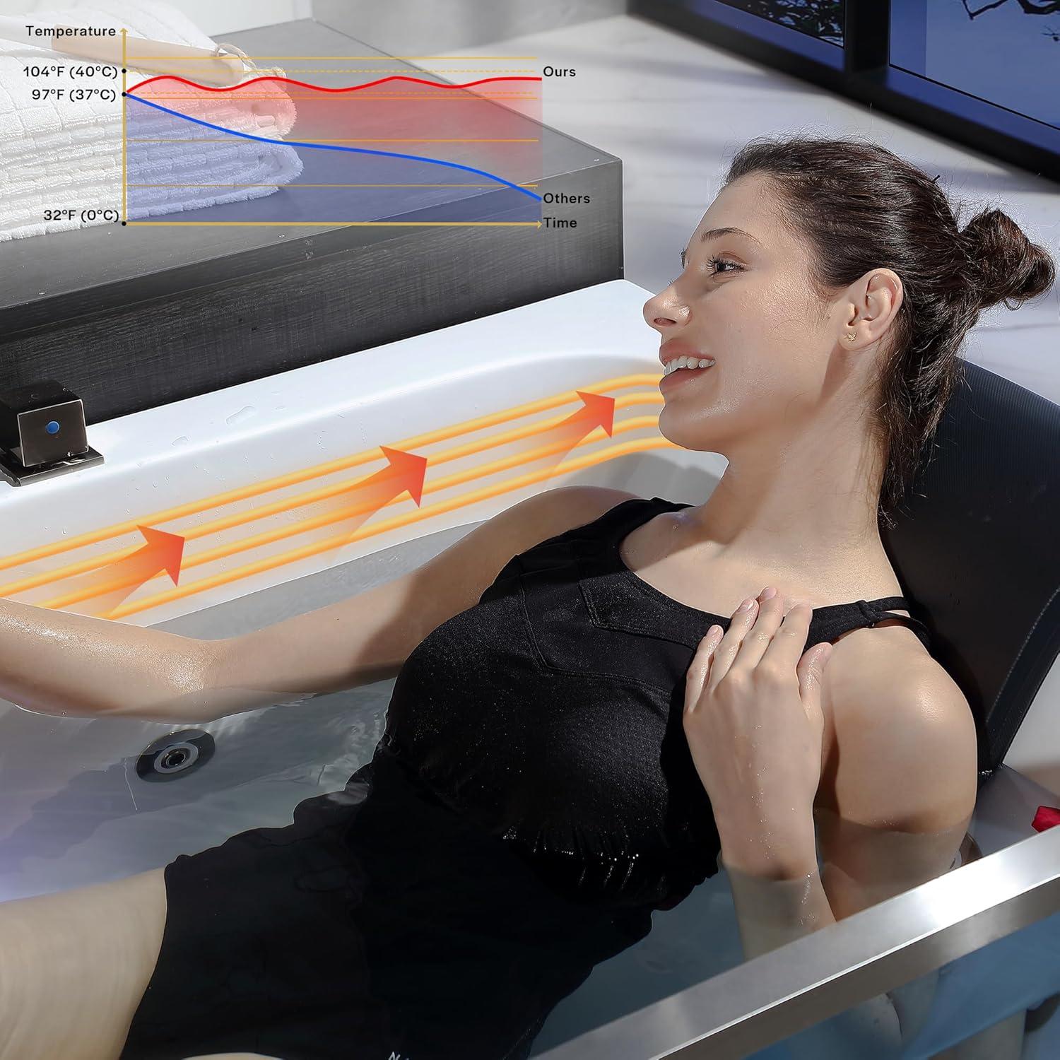 Heated Comfort & Ergonomic Design-The inline heater maintains water warmth between 96.8°F–104°F (add hot water initially). Recline comfortably at a 125° angle in the spacious 71″L x 33.5″W tub, with a 18″ soaking depth for full shoulder submersion.