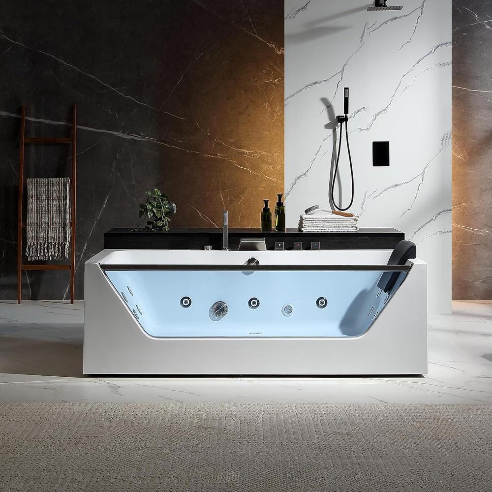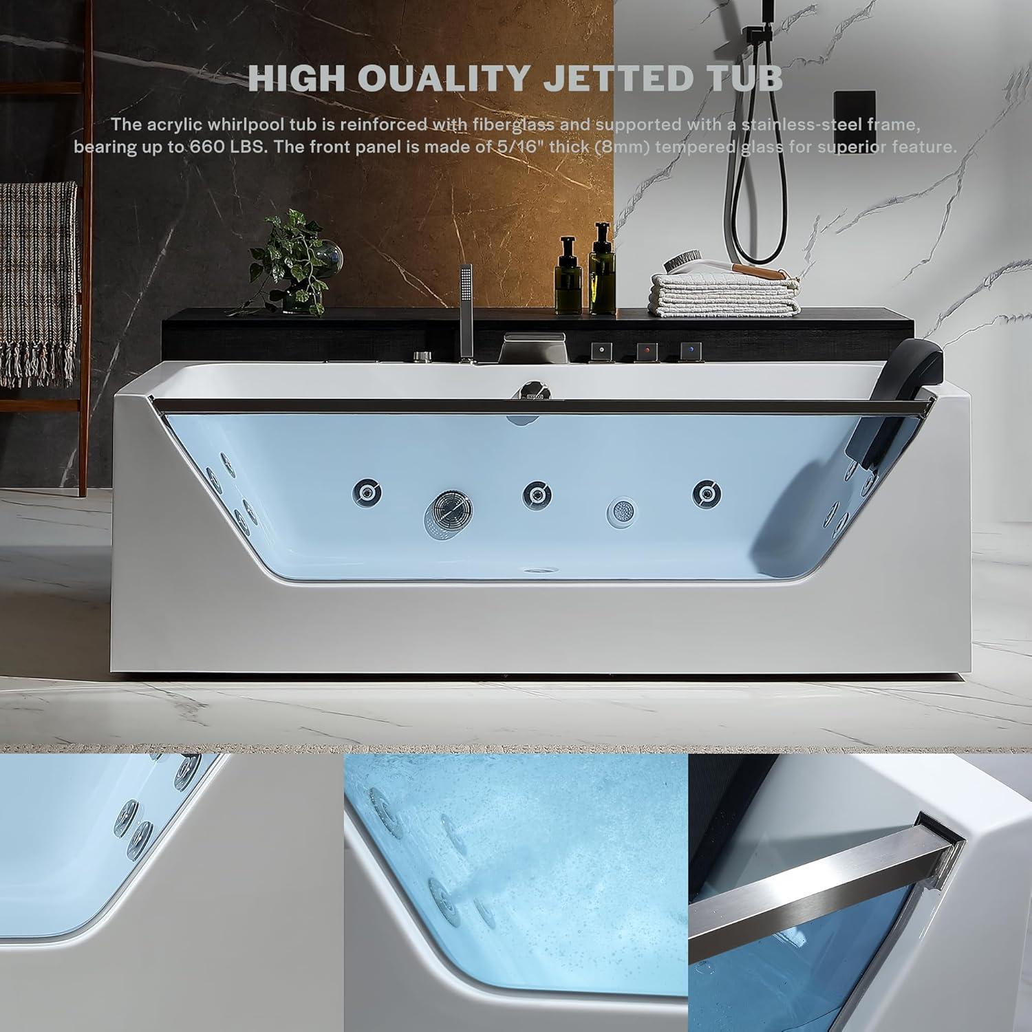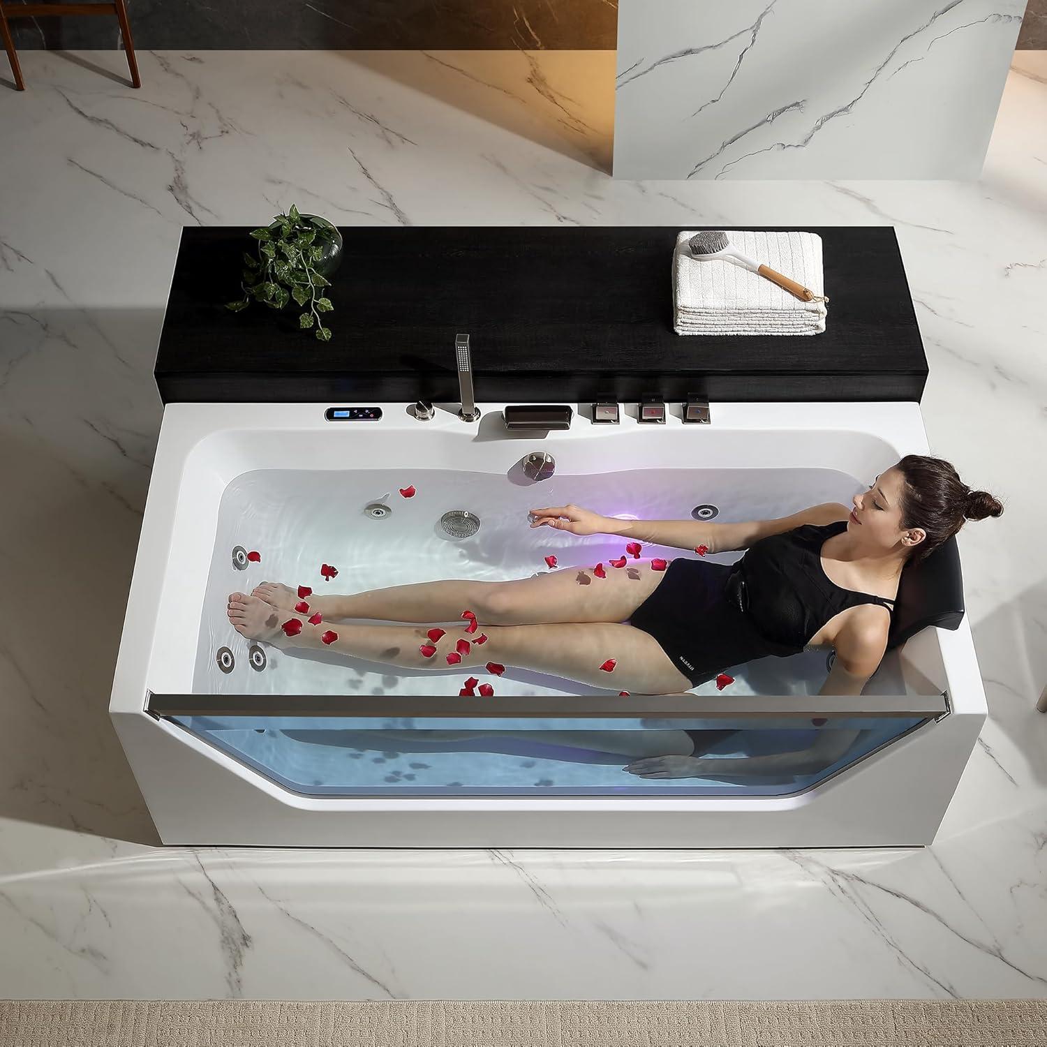 Striking Glass Design Element: With a sleek glass panel, this jetted tub adds contemporary elegance to your bathroom. It not only serves as a window to the swirling water within but also enhances the chromatic effects of the whirlpool bathtub with jets.