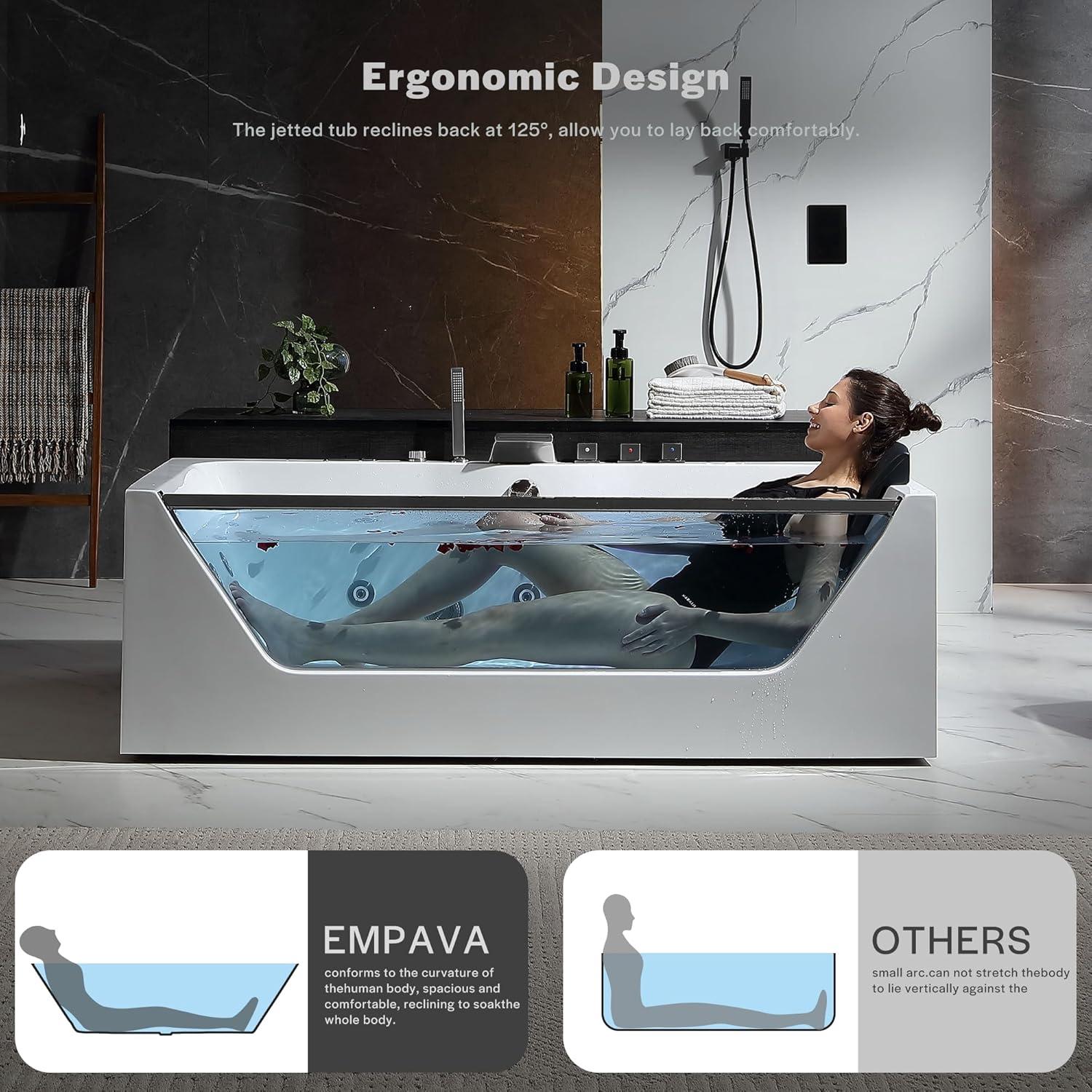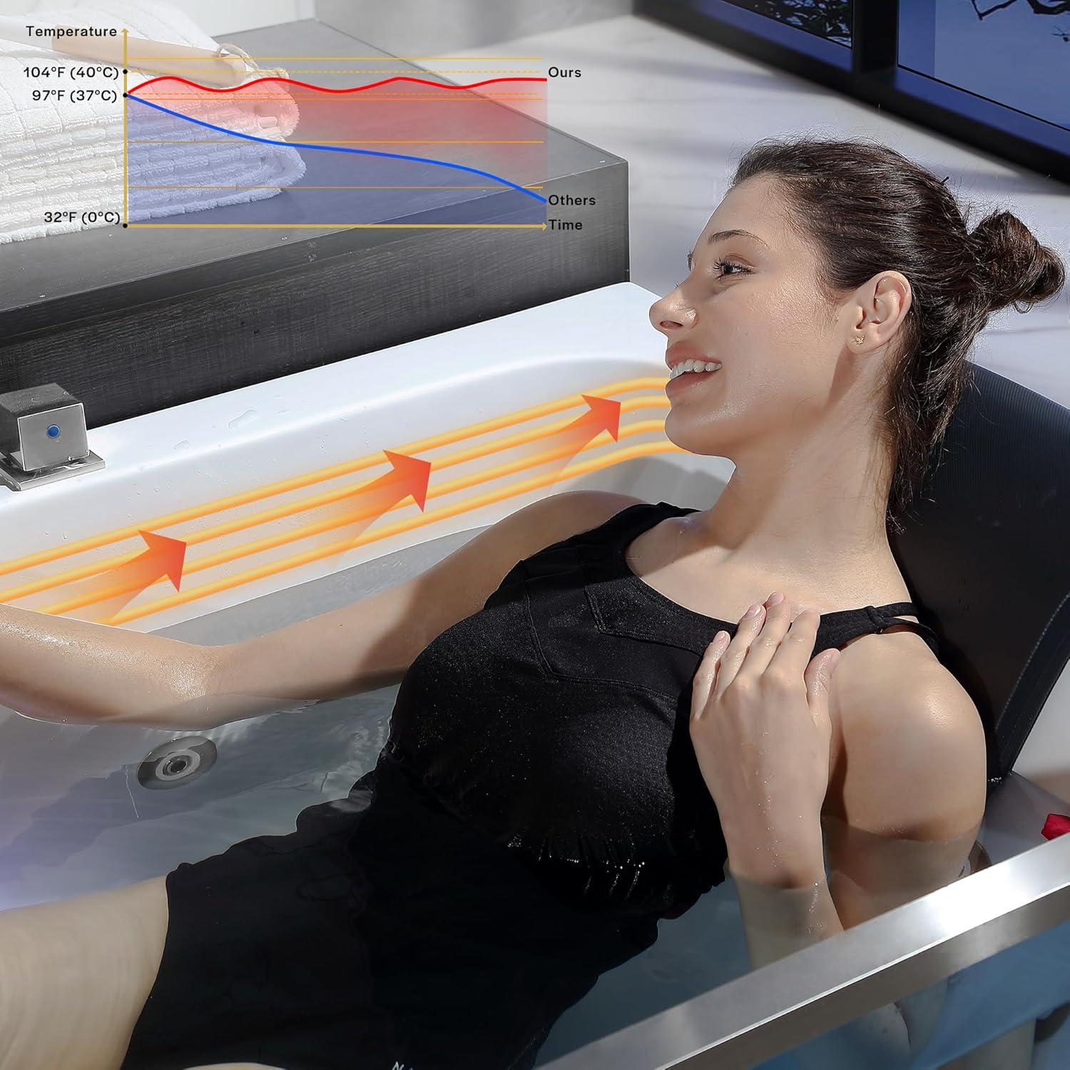 Heated Comfort & Ergonomic Design-The inline heater maintains water warmth between 96.8°F–104°F (add hot water initially). Recline comfortably at a 125° angle in the spacious 71″L x 33.5″W tub, with a 18″ soaking depth for full shoulder submersion.