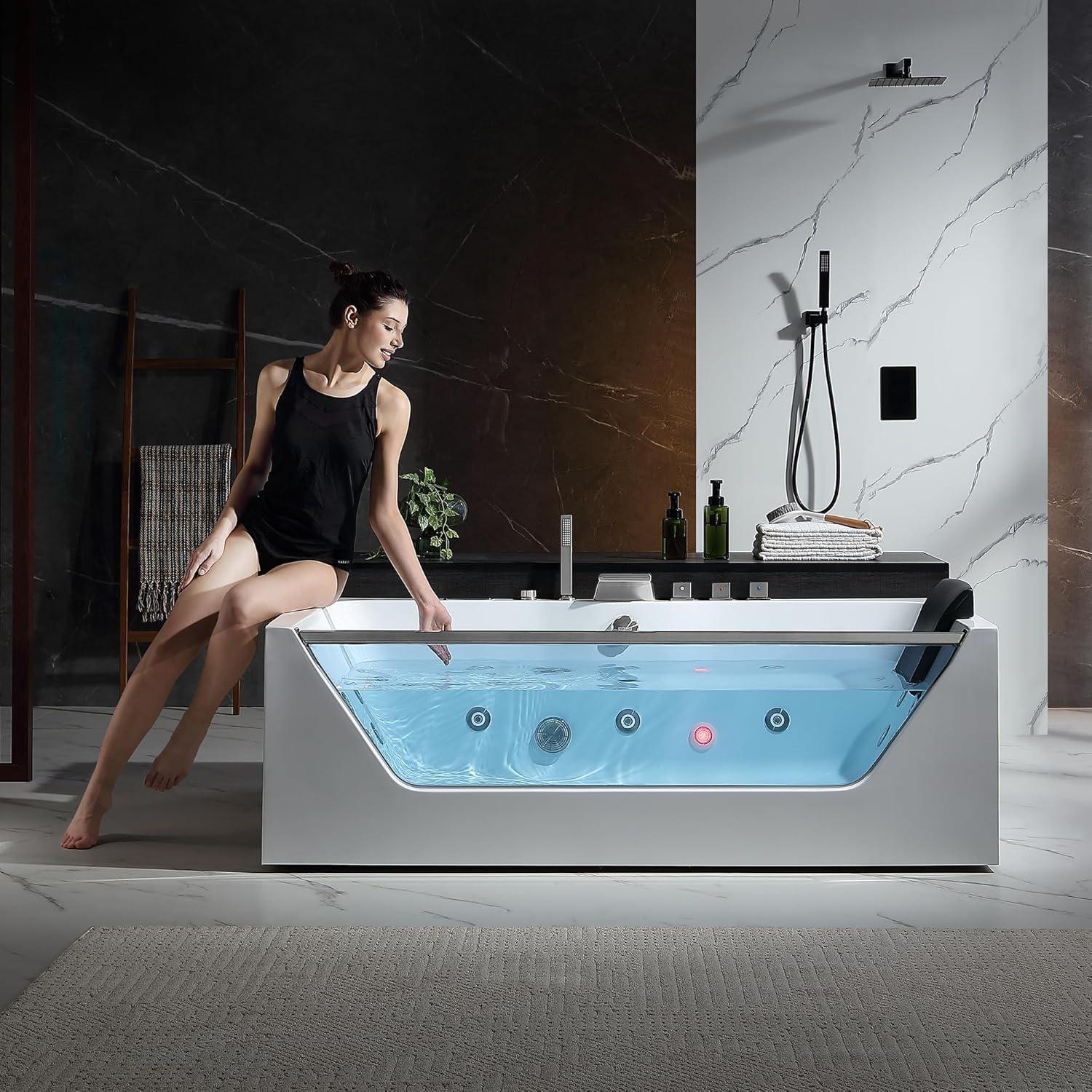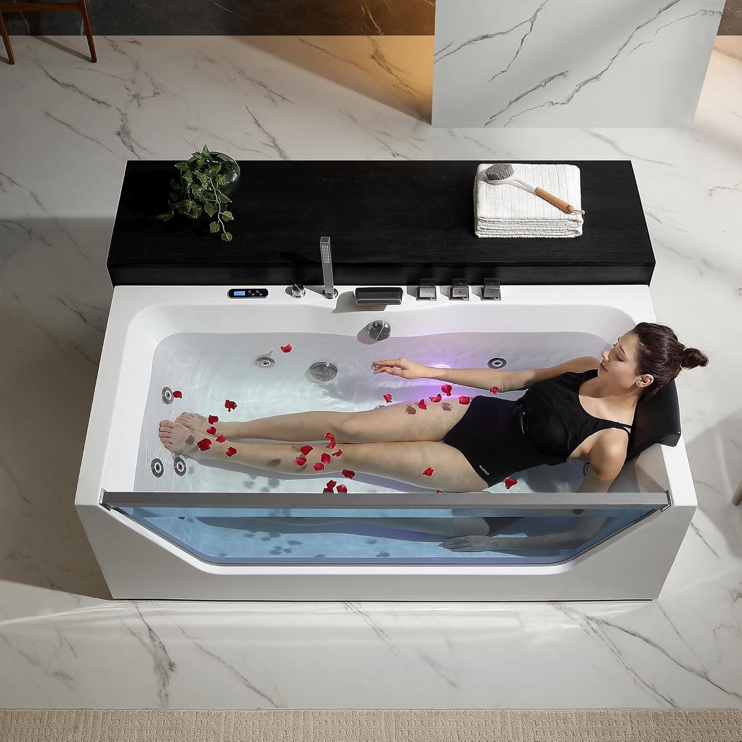 Striking Glass Design Element: With a sleek glass panel, this jetted tub adds contemporary elegance to your bathroom. It not only serves as a window to the swirling water within but also enhances the chromatic effects of the whirlpool bathtub with jets.