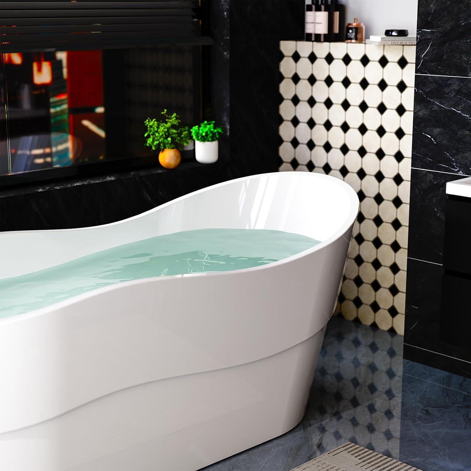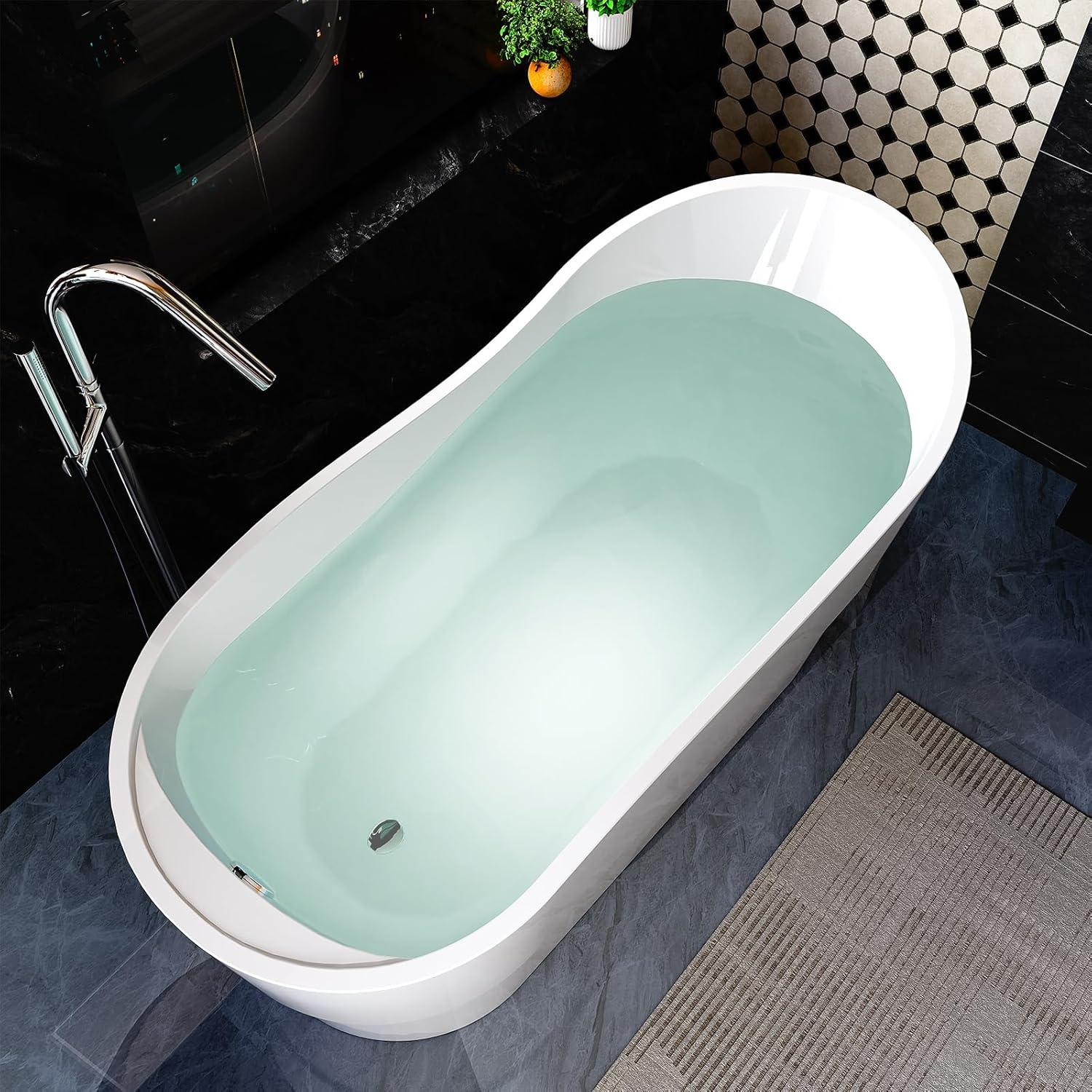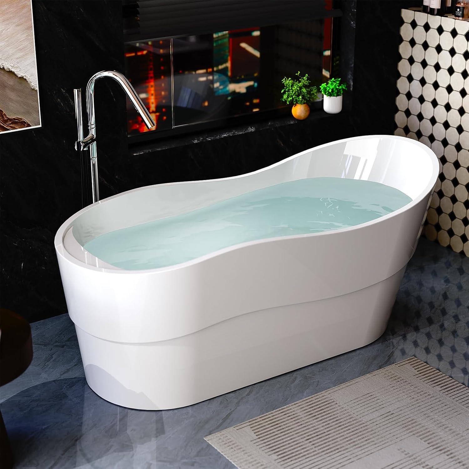 Empava Freestanding Bathtub, 59 Inch Soaking Tub, Luxury Acrylic Streamline Stand Alone Shower Tub for Adults with Overflow and Drain, Easy Installation, White(59 Inch)