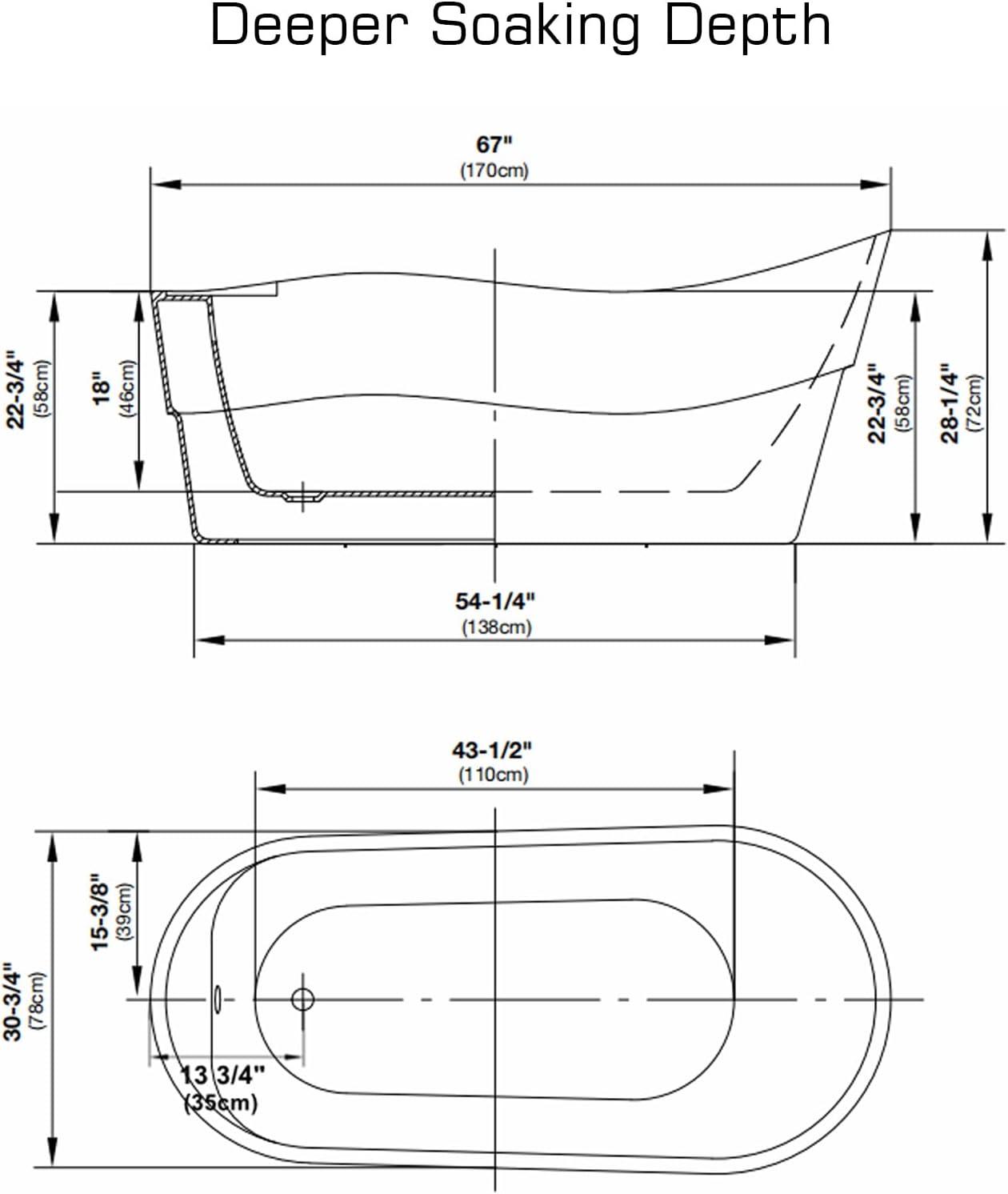 🛁【DIMENSIONS AND SPECIFICATIONS】 Flexible pop-up chrome drain and slotted overflow included; With a 67-inch length and 15-inch soaking depth, exterior dimension: 67” L * 29” W* 27” T, Effective tab capacity: 60 Gallons.