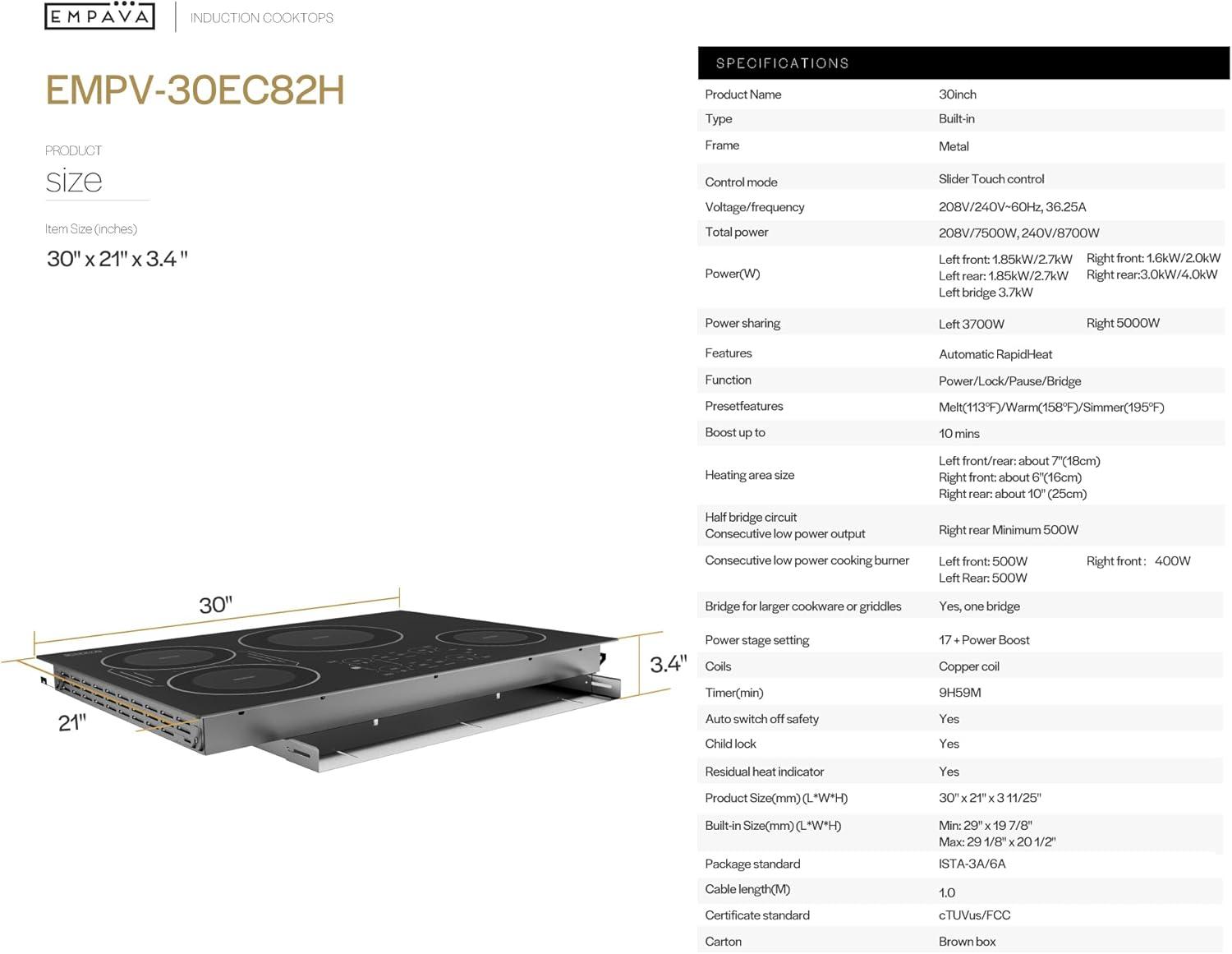 Empava Built-In Electric Induction Cooktop 36 Inch, Bridge-SYNC Element, Auto RapidHeat, 3 Preset Modes, Pan Sensor, Hardwired 208~240V, 50A, Black Vitro Ceramic Glass(30 Inch)