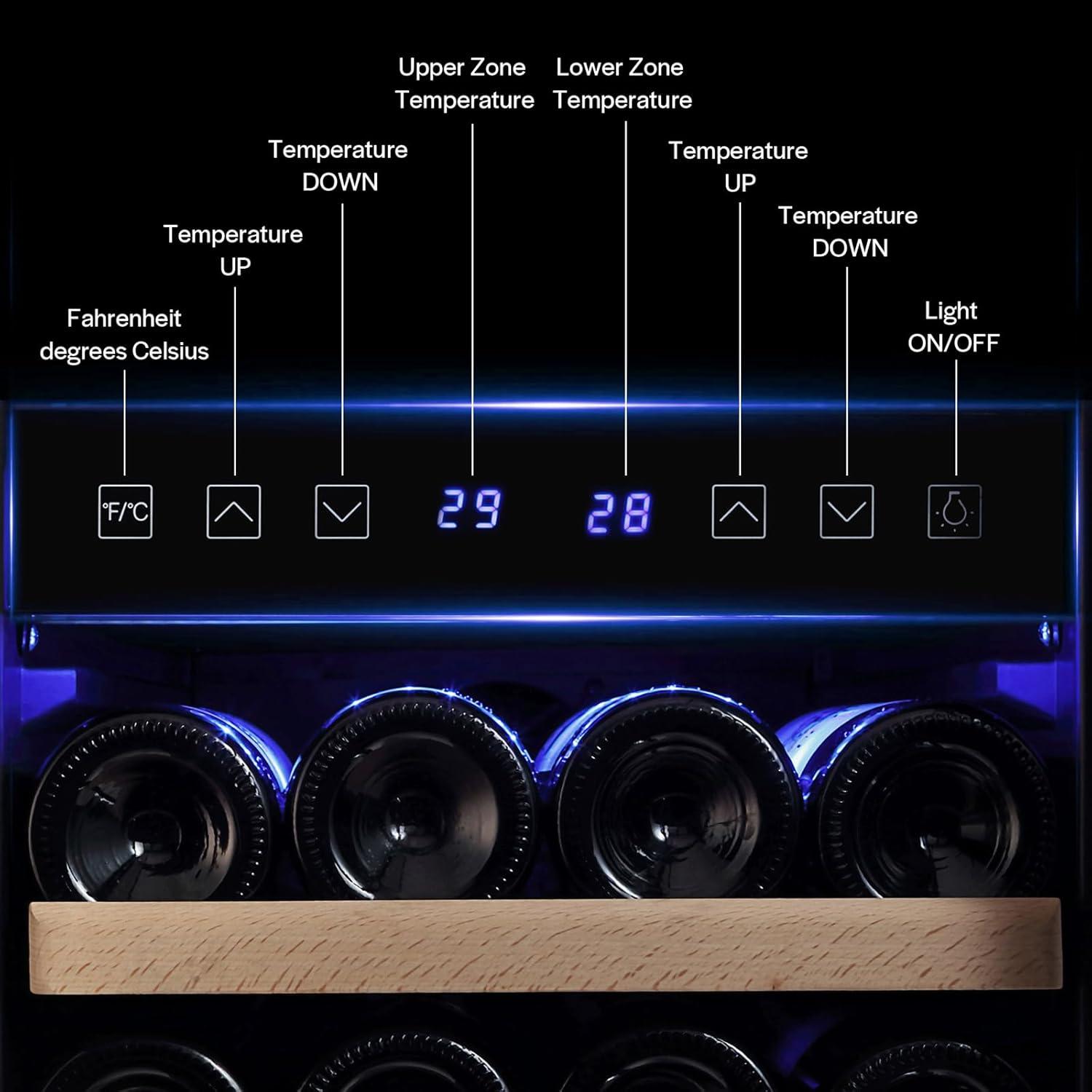 You can customize the temperature by touching the control panel. Upper zone 40°F -50°F(5℃-10℃), lower Zone 50°F -66°F(10℃-18℃). The two zones feature different temperatures so that your wine is perfectly chilled at its optimal temperatures for pure enjoyment. The internal soft blue LED light keeps your wine in a beautiful environment and helps the selection of your favorite wine at all times.