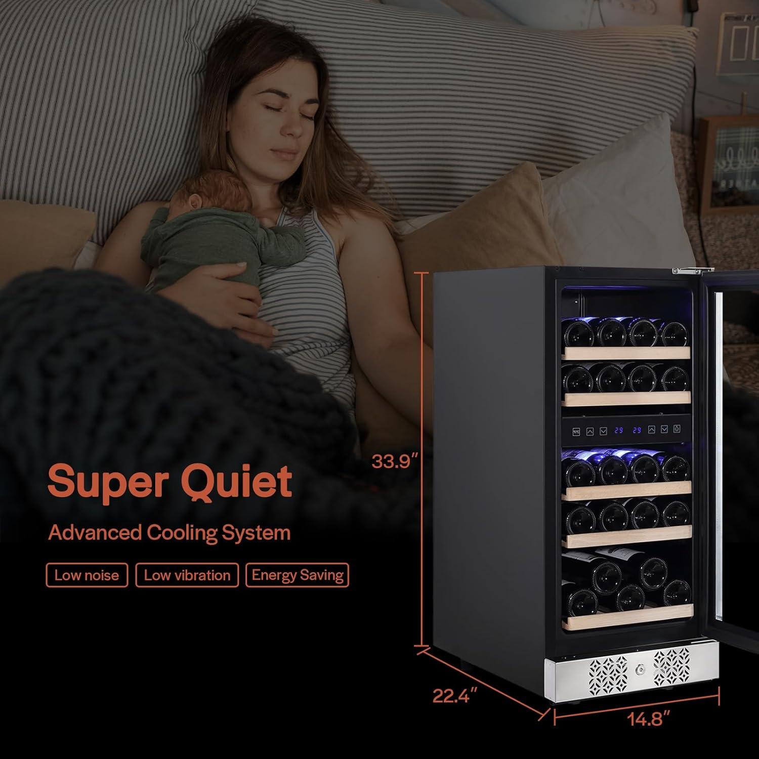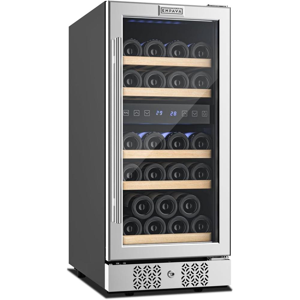 The roomy Empava Double Zone 29 Bottles Wine Fridge slides easily between standard base cabinets to create the ultimate wine cellar in your custom kitchen. It can also stand alone anywhere you like. This sleek and slim 29 bottle wine cellar allows you to tuck your reds or whites away behind a tempered glass door. Effortlessly examine which bottle you'll indulge in next with fully extended smooth shelving.