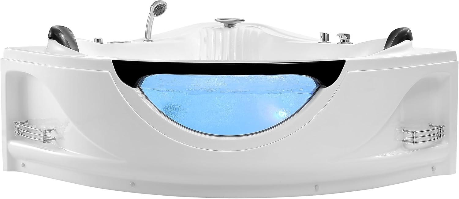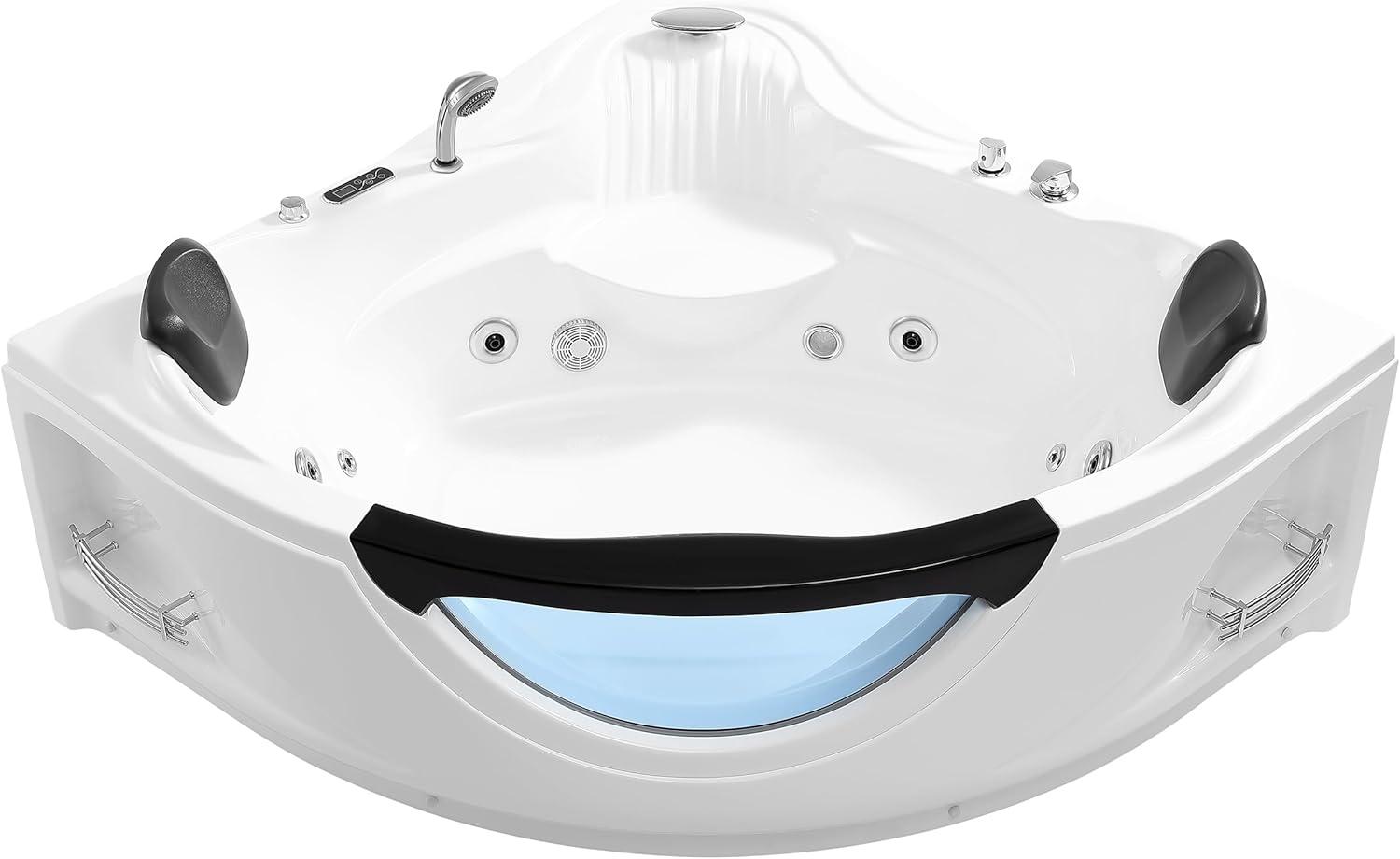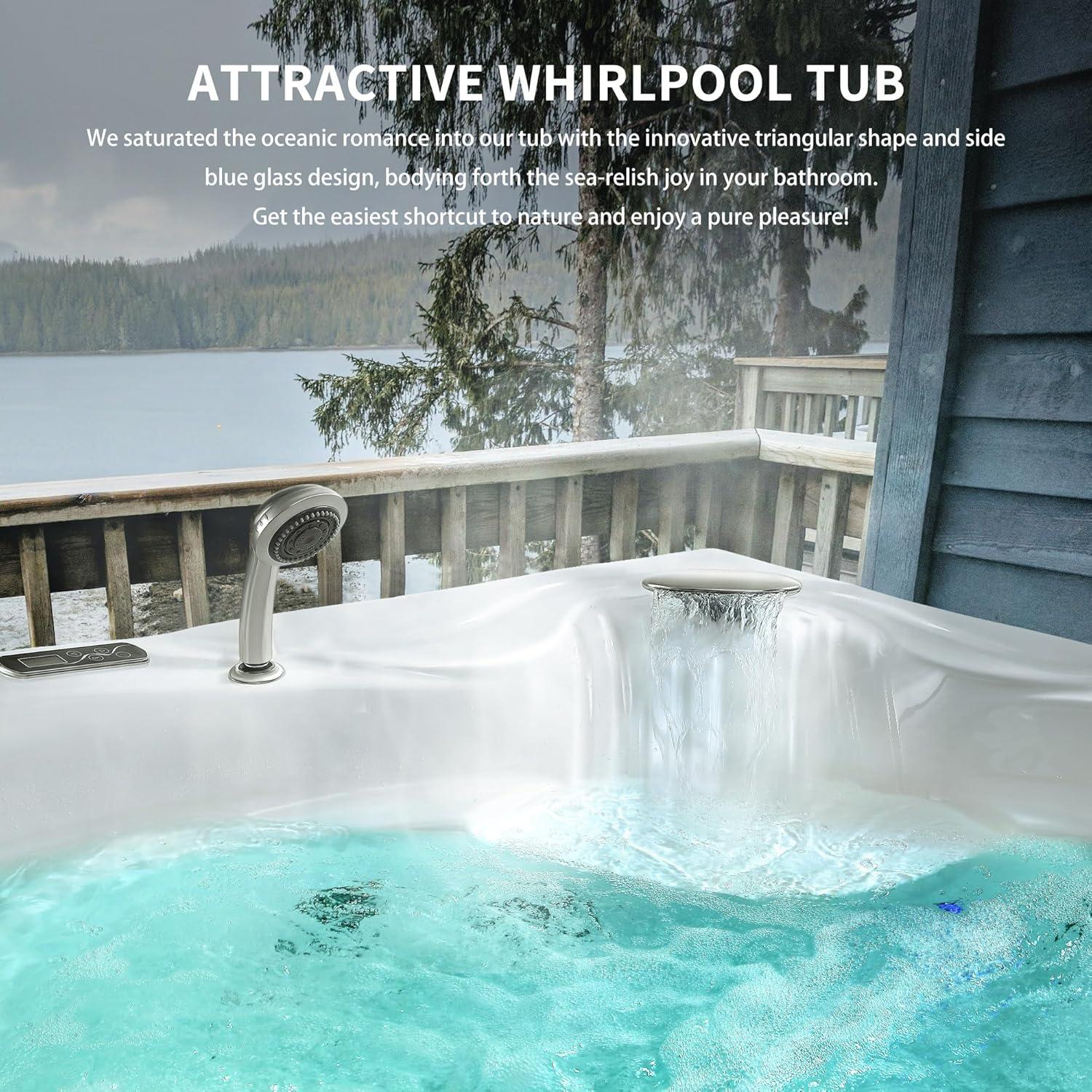Beautiful Whirlpool Tub: We saturated the oceanic romance into our tub with the innovative triangular shape and side blue glass design, bodying forth the sea-relish joy in your bathroom.Get the easiest shortcut to nature and enjoy a pure pleasure!