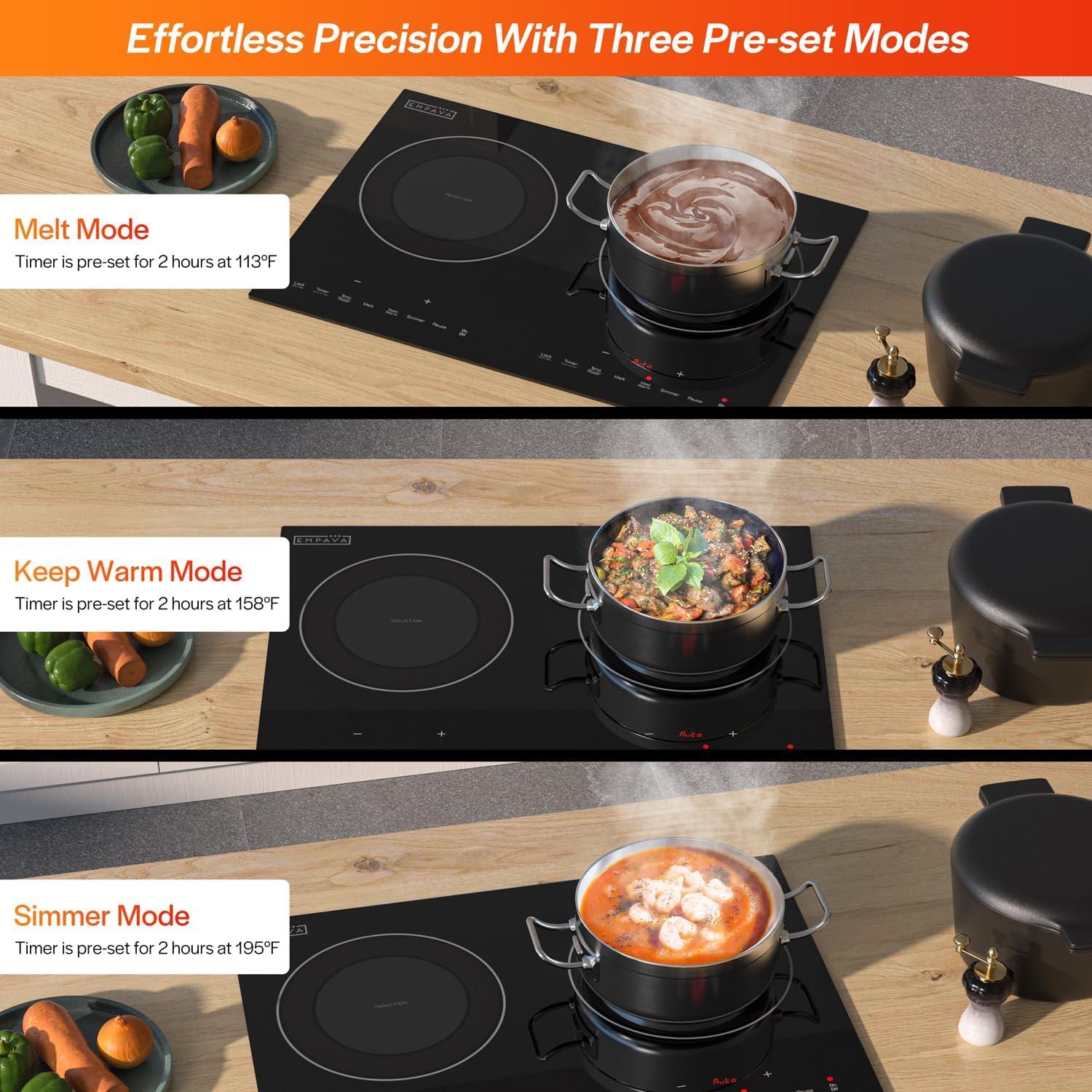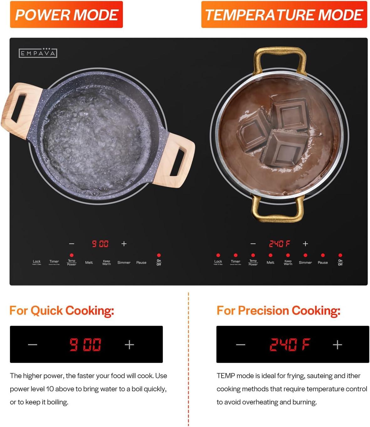 Ultimate Cooking Flexibility: Empava's 2-burner induction cooktop offers precise temperature control from 120°F to 460°F, accommodating a range of cooking techniques. Whether you're simmering, melting, or keeping food warm, adjust to the perfect heat with ease .