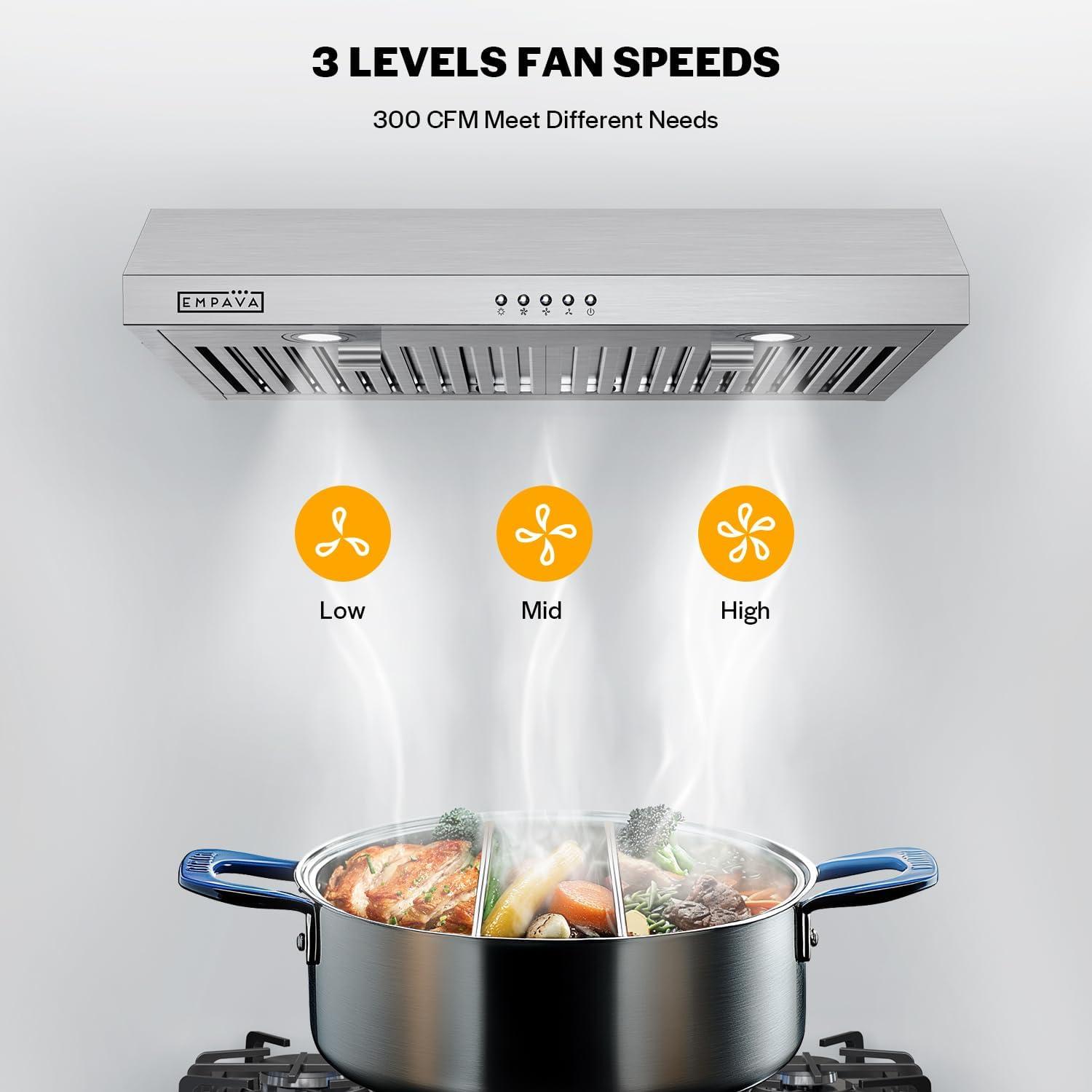 【300 CFM Performance with Quiet Operation】: Experience efficient smoke and odor removal powered by a 300 CFM motor. Operating at just 69 dBA, the 3-speed push-button controls allow quick and precise airflow adjustments for a stress-free cooking environment.