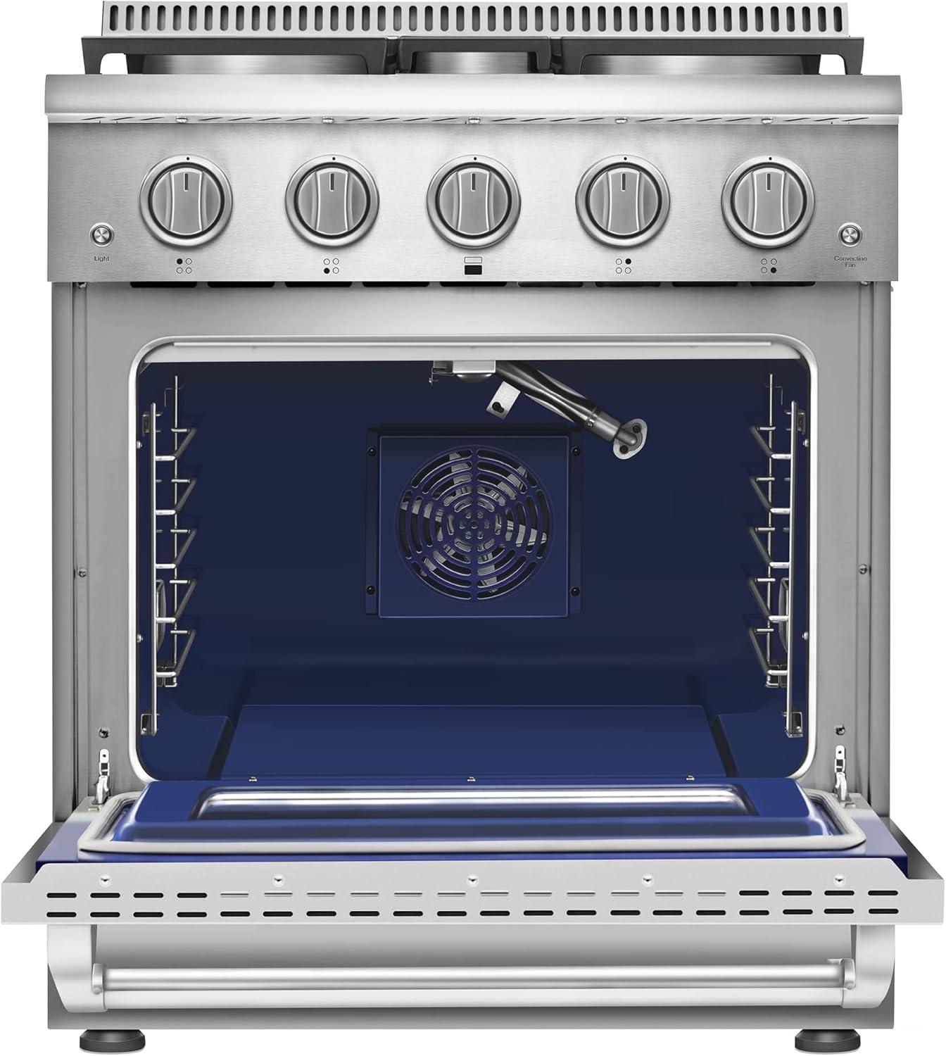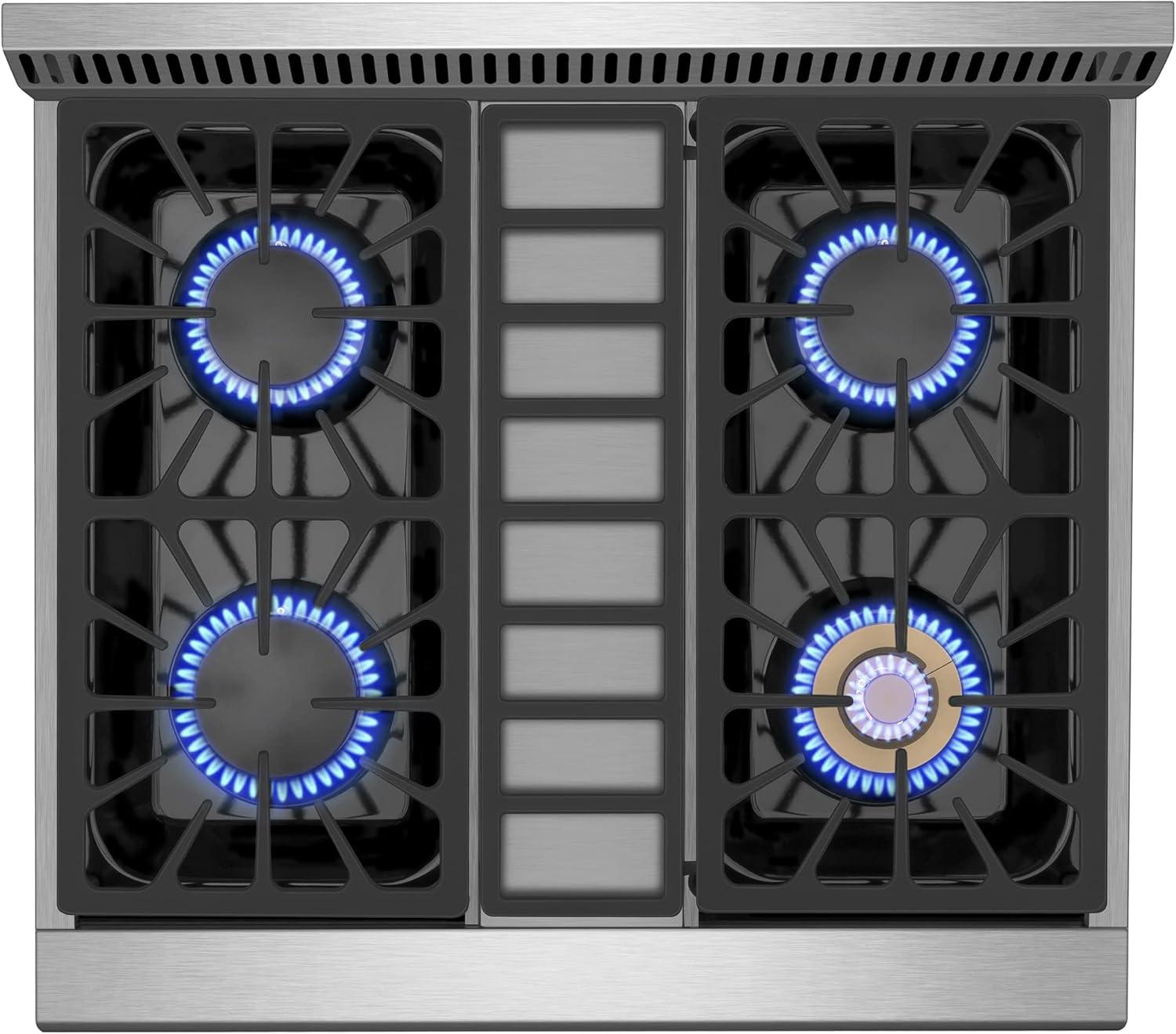 Versatile 5-Burner Cooktop for Every Cooking Need: This gas range features a powerful 18,000-BTU dual-ring burner for intense heat, an 8,800-BTU rapid burner, two 6,900-BTU semi-rapid burners, and a 5,000-BTU simmer burner for delicate sauces. Whether you're stir-frying, boiling, or simmering, enjoy precise heat control for every recipe