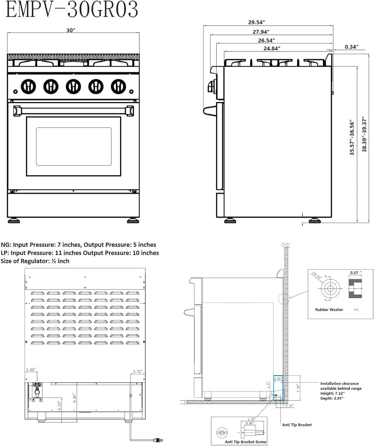 Designed to Fit Your Kitchen with Easy Setup: With product dimensions of 35.4″ W x 25.3″ D x 35.4″ H, this gas range fits standard kitchen layouts. It includes a pre-installed 120V power cord, a gas regulator, and LP/NG nozzles for a hassle-free installation