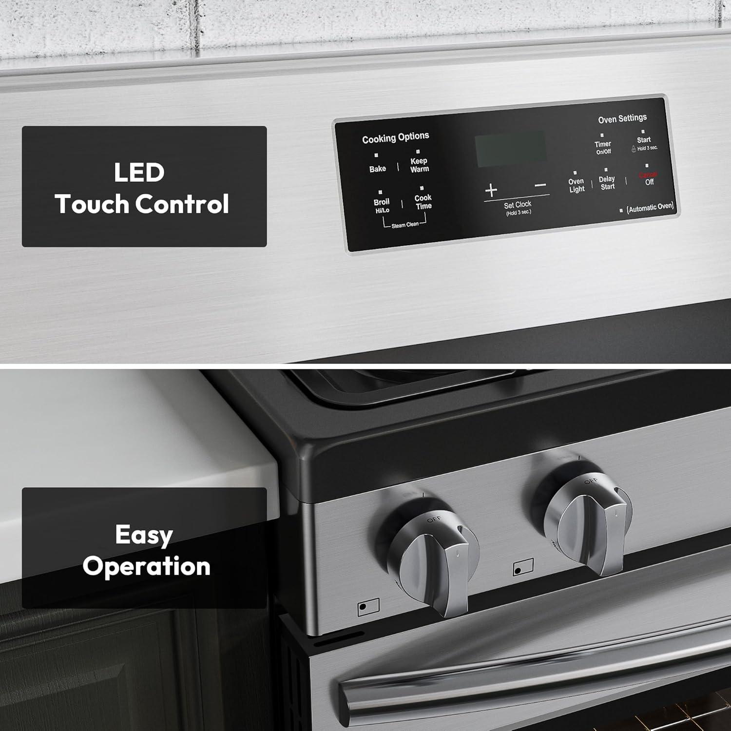 Convenient LED Touch Control Panel – Modern LED touch controls make operating this gas stove with oven effortless. Easily adjust temperature settings and select cooking functions with precision at your fingertips
