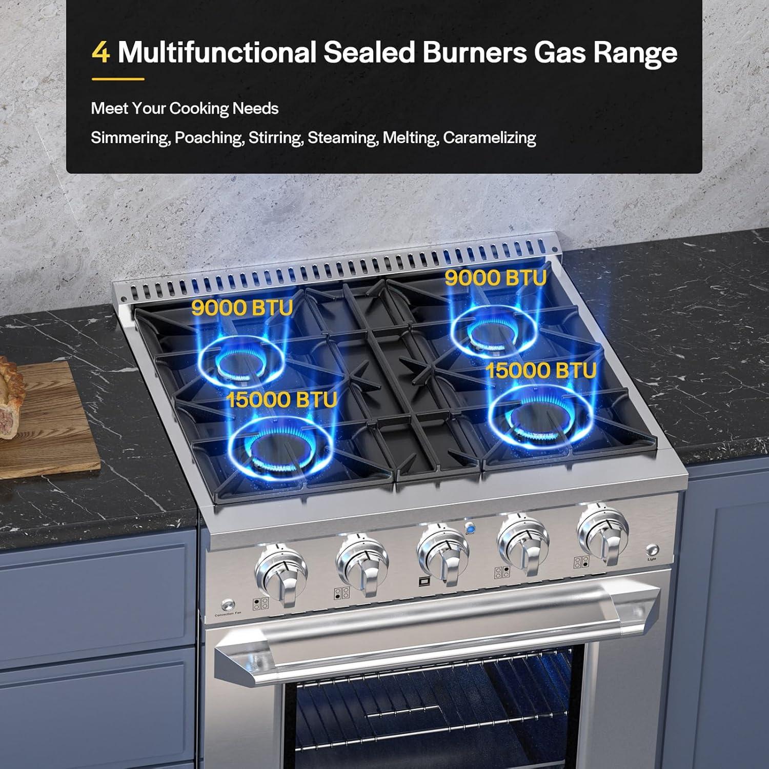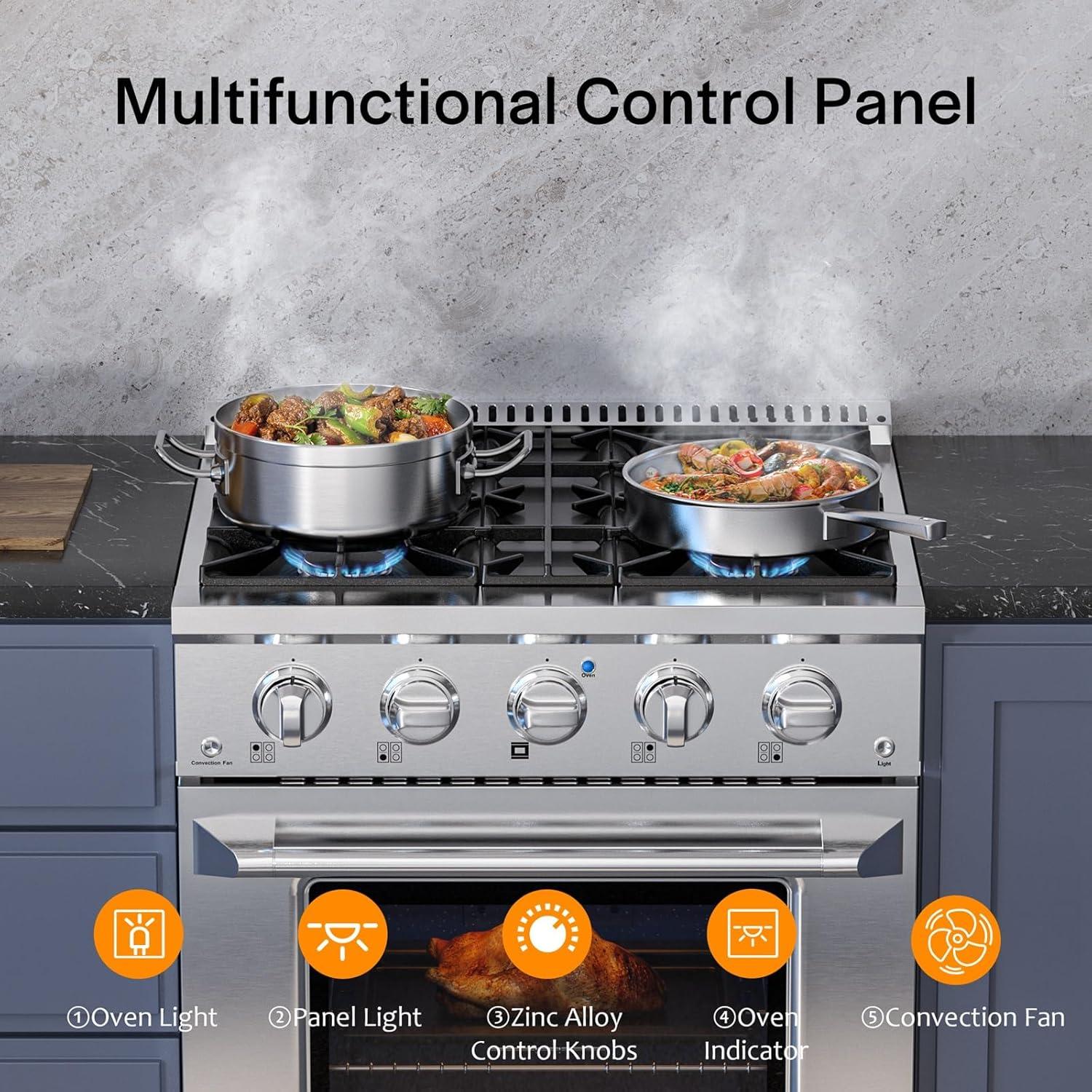 Convenient Features: The gas range stove comes with a large oven window and halogen oven light, allowing you to see your food while cooking without opening the door. The ergonomic knobs and triple-layer tempered glass add to the eye-catching aesthetic of the complete exterior design