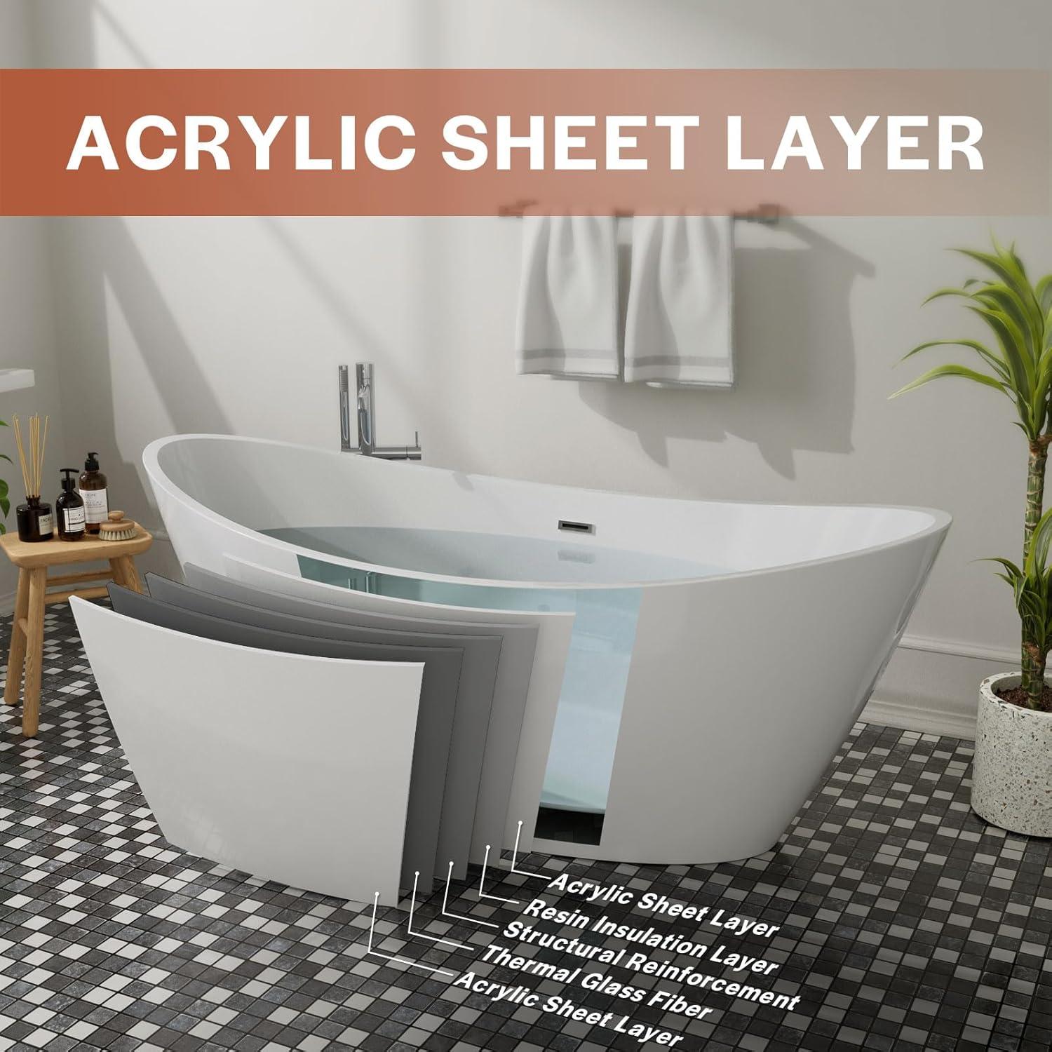 ** Acrylic and reinforced with fiberglass for long lasting durability. Relax and wind down in your pure-scape luxurious freestanding soaking tub by Empava, featuring 100% glossy white acrylic and a contemporary stand-alone design that complements any bathroom décor.
