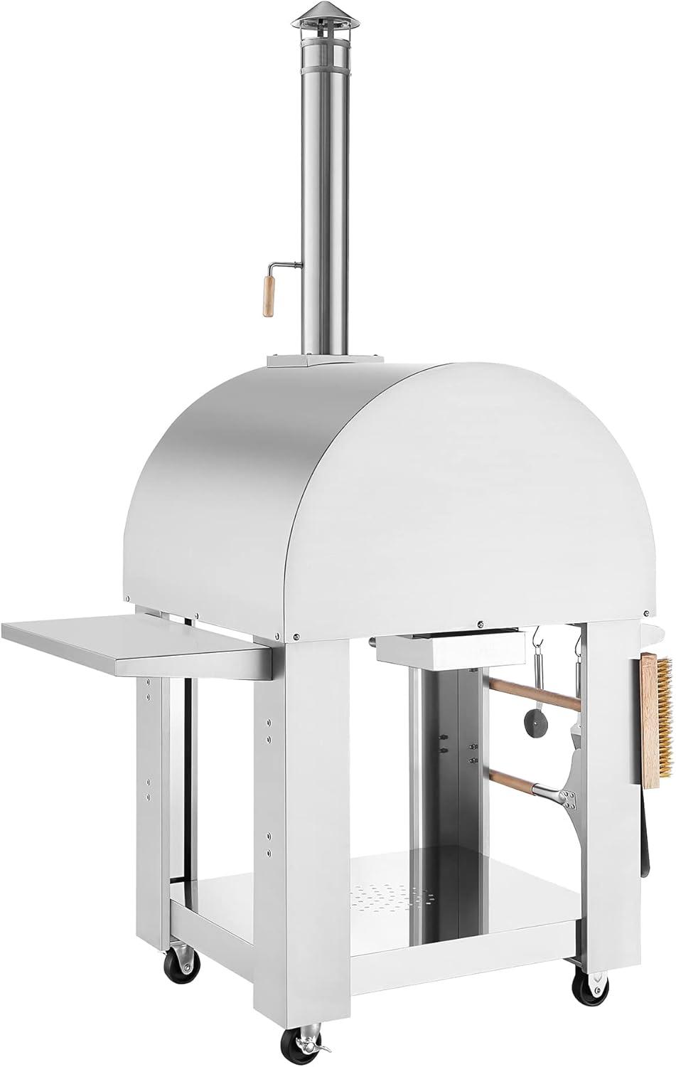 Portable Pizza Oven: With a focus on convenience and mobility, this pizza oven boasts a removable ash drawer, a bottom storage cabinet, and Accessories racks, offering a practical solution for storing cleaning supplies and cooking tools. Furthermore, it is equipped with 4-wheels, which turns the pizza oven outdoor into a portable oven so that you can move it into the garage when not in use