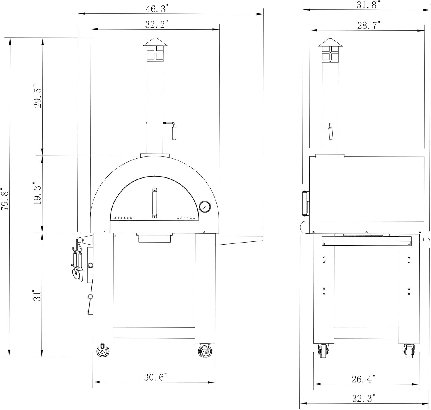 Dimensions:38.6 in. W x 31 in. D x 78.8 in. H; Cooking Area: 25 in x 30 in, meaning you can cook pizzas of up to 24 inches, Crafted from robust stainless steel #430 and has a strong stainless steel finish for a long-lasting oven