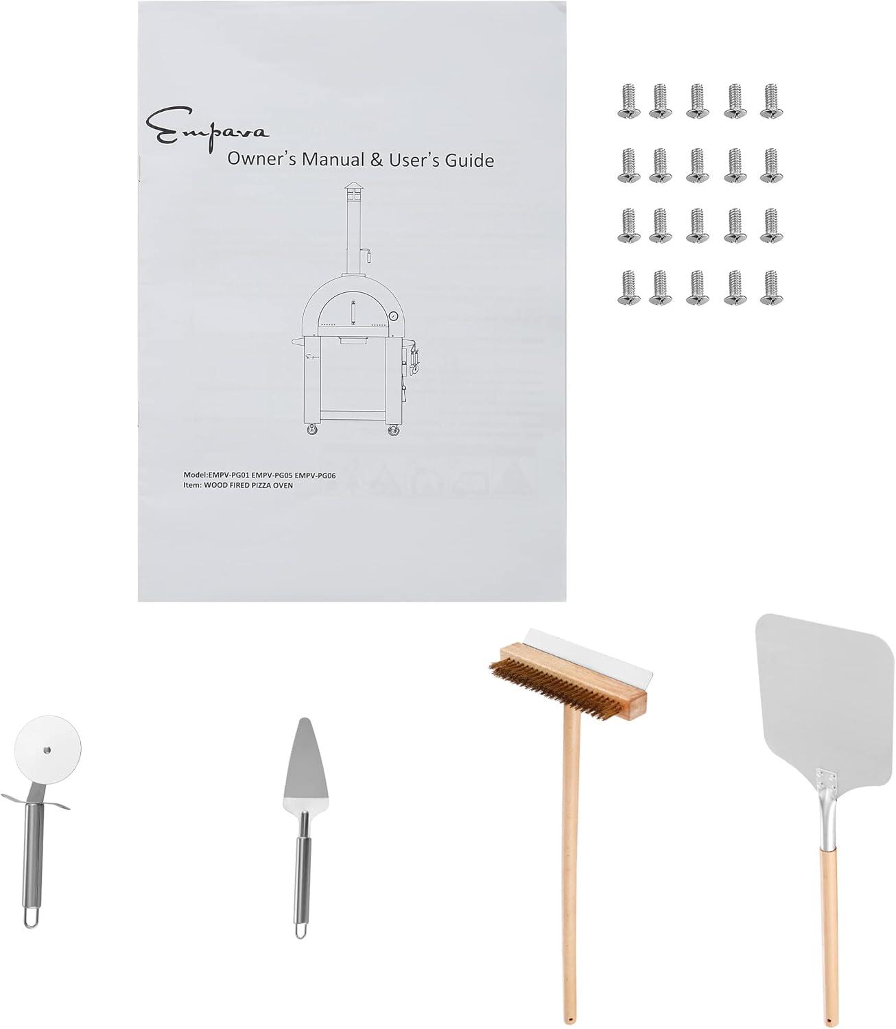 All-in-One Oven Kit: Include 1 x Pizza oven,1 x pizza scraper,1 x pizza cutter,1 x pizza shovel,1 x pizza brush,4 x hooks and 1 x manual. The wood fire pizza oven is more than a pizza maker, try out all your favorite recipes to roast chicken, meat, shrimp, and vegetables, and bake bread, cookies, pies, and any other pastry to perfection
