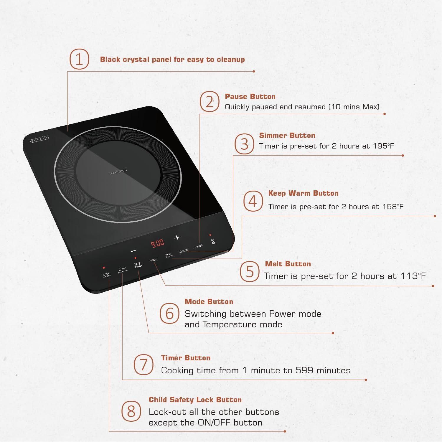 【Temperature Mastery at Your Fingertips】: With 18 distinct temperature levels, this cooktop puts the power of culinary precision in your hands. Choose from three quick-access preset temperatures for common cooking needs, or dial in the exact heat you require for gourmet dishes. Adjusting the duration of cooking mid-process is straightforward and hassle-free, ensuring your meals are cooked just right.