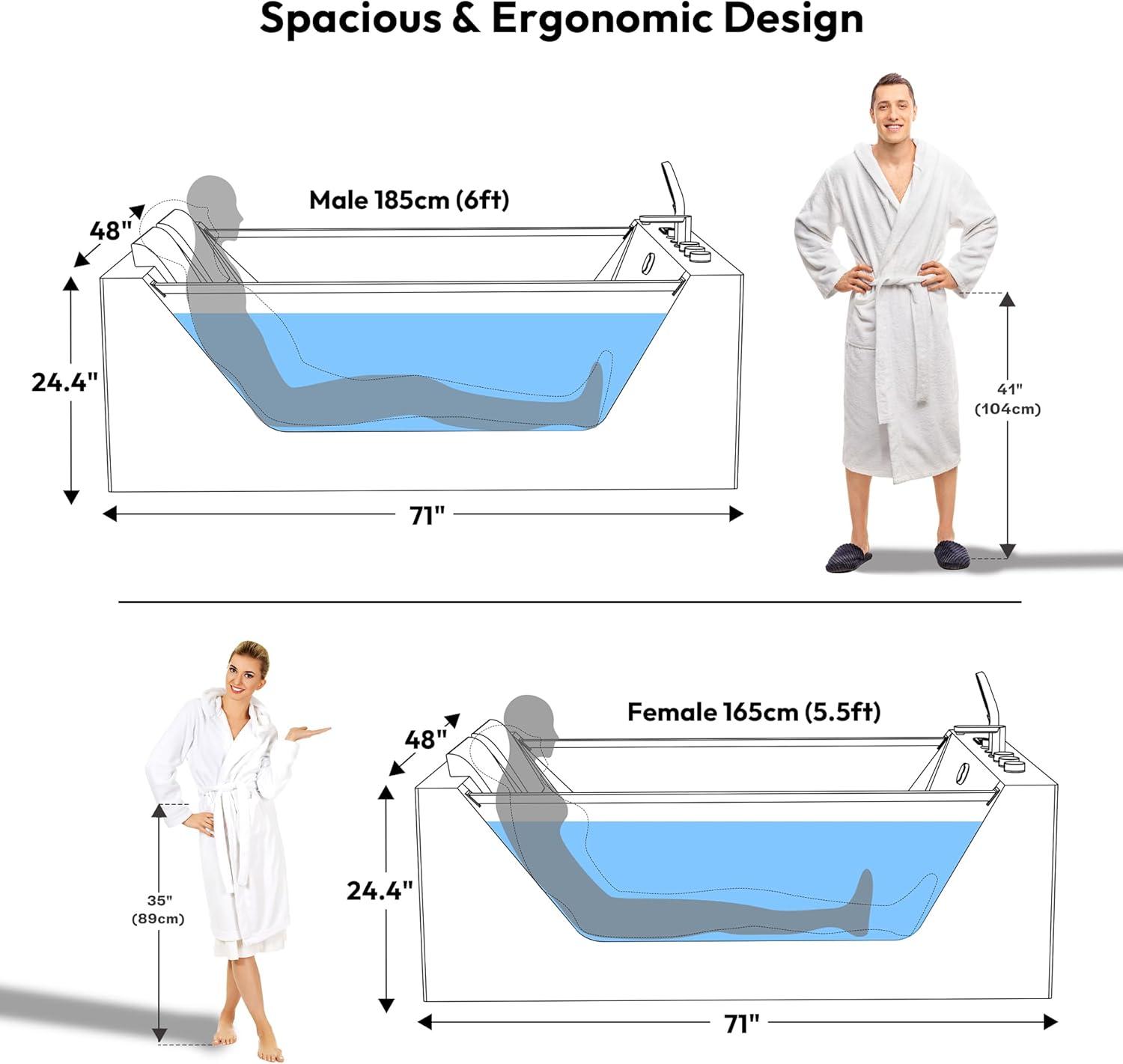 71” Spacious Dual-Soak Design: Designed for couples, this 71” x 48” jetted tub offers a deep soaking well and ergonomic contours. Fits two adults comfortably, making it a luxurious spa tub for shared relaxation