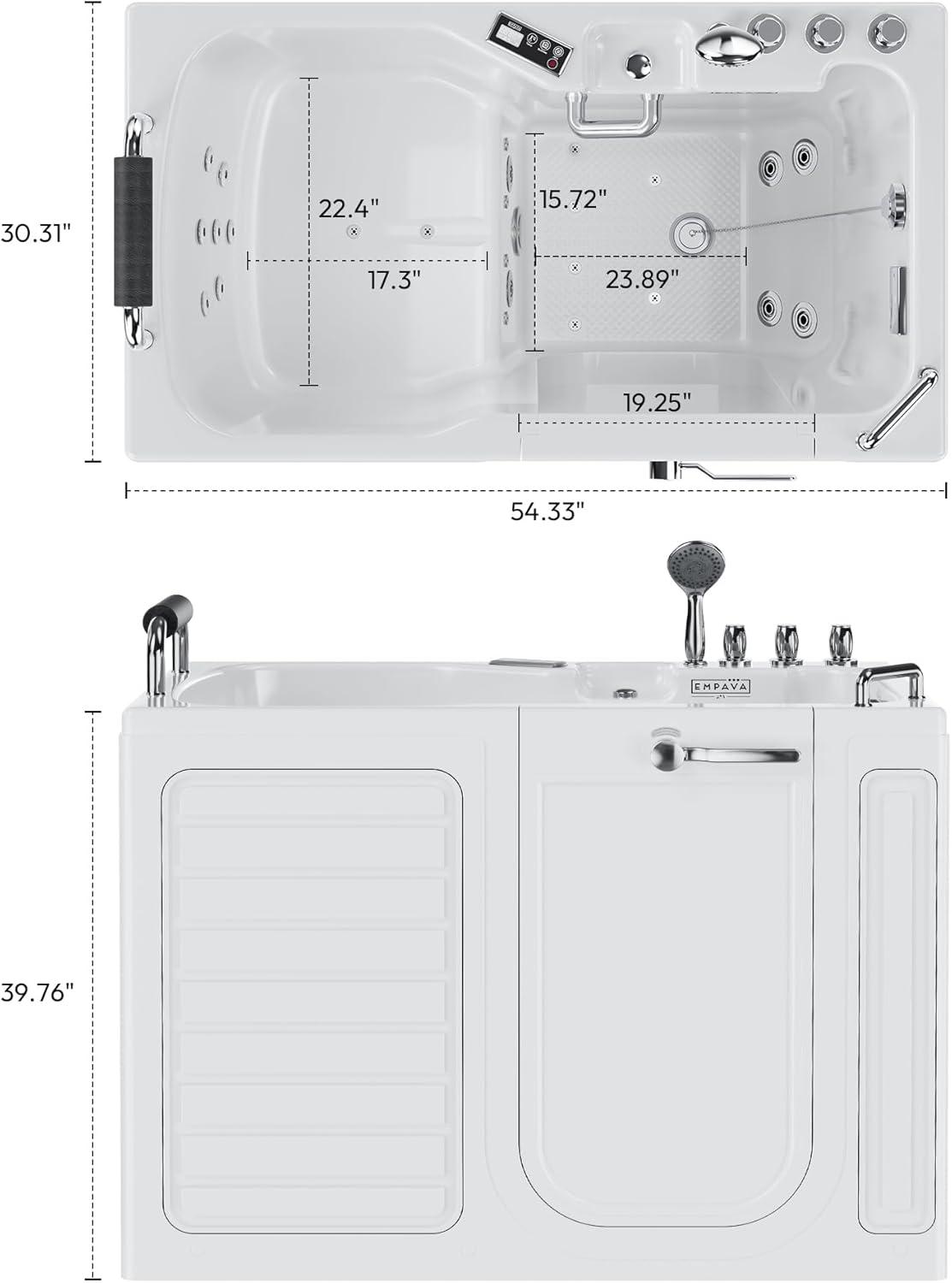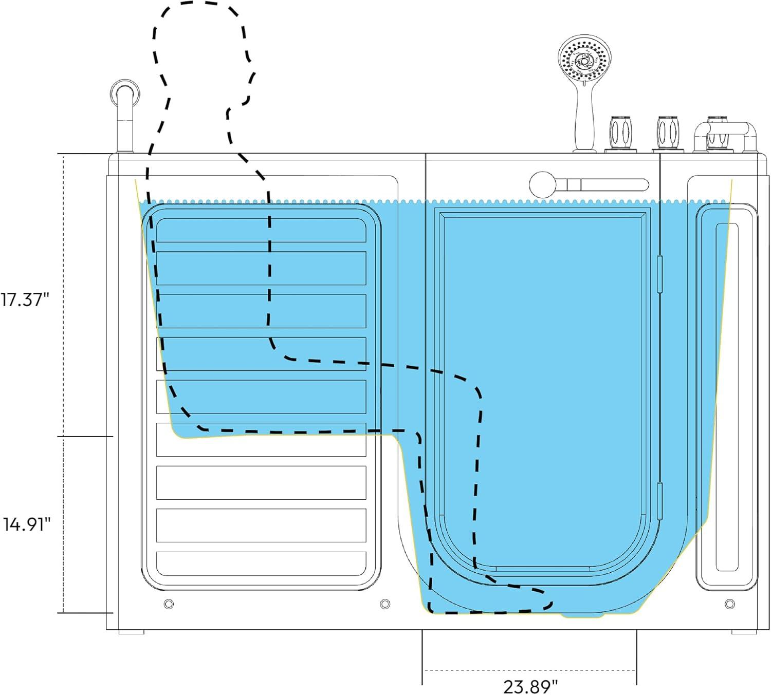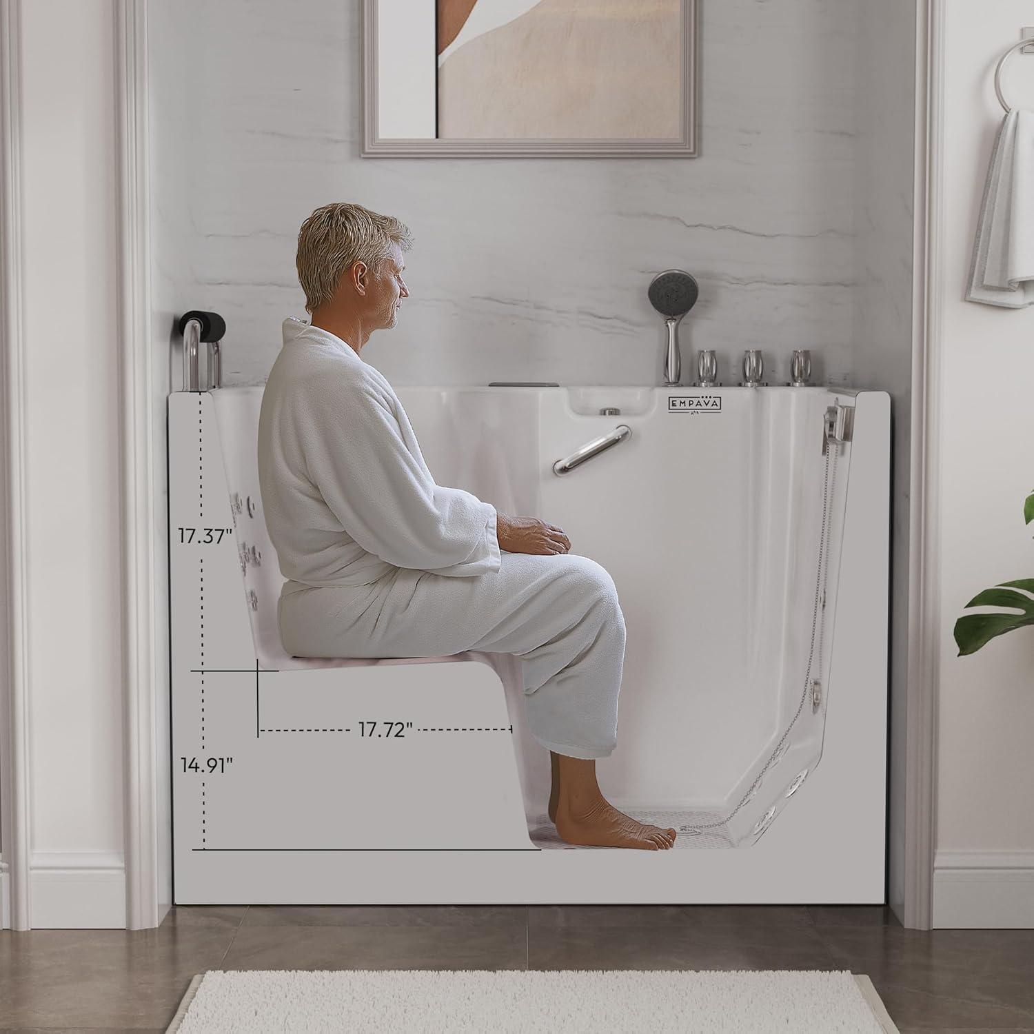 Ergonomic and Accessible Design: This walk-in bathtub is designed for easy access and use by seniors. It features a 19.25″ wide right outward-opening door and a low threshold for safe entry and exit. The seat, with dimensions of 22.4″ x 17.3″ at the base and expanding to 26.37″ x 20.86″ at the top, accommodates larger users comfortably, providing ample space for relaxation.
