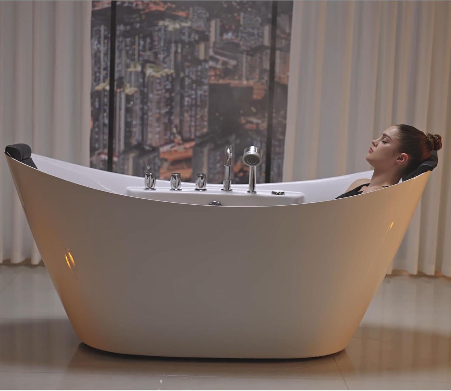 Comfy Reading Elbow Support: The boat-shaped design of this 59 inch freestanding jetted tub is perfect for those who enjoy reading while bathing. It forms an angle at the elbow position, providing optimal comfort for extended reading periods.